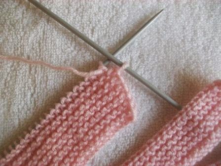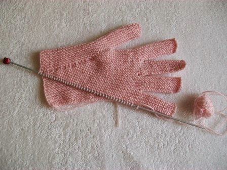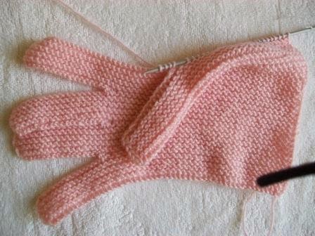 Набираем на спицы обычным набором столько петель, сколько в длину Ваша перчатка от начала манжета до кончика мизинца. И вяжем платочной вязкой полотно на ширину мизинца платочной вязкой.