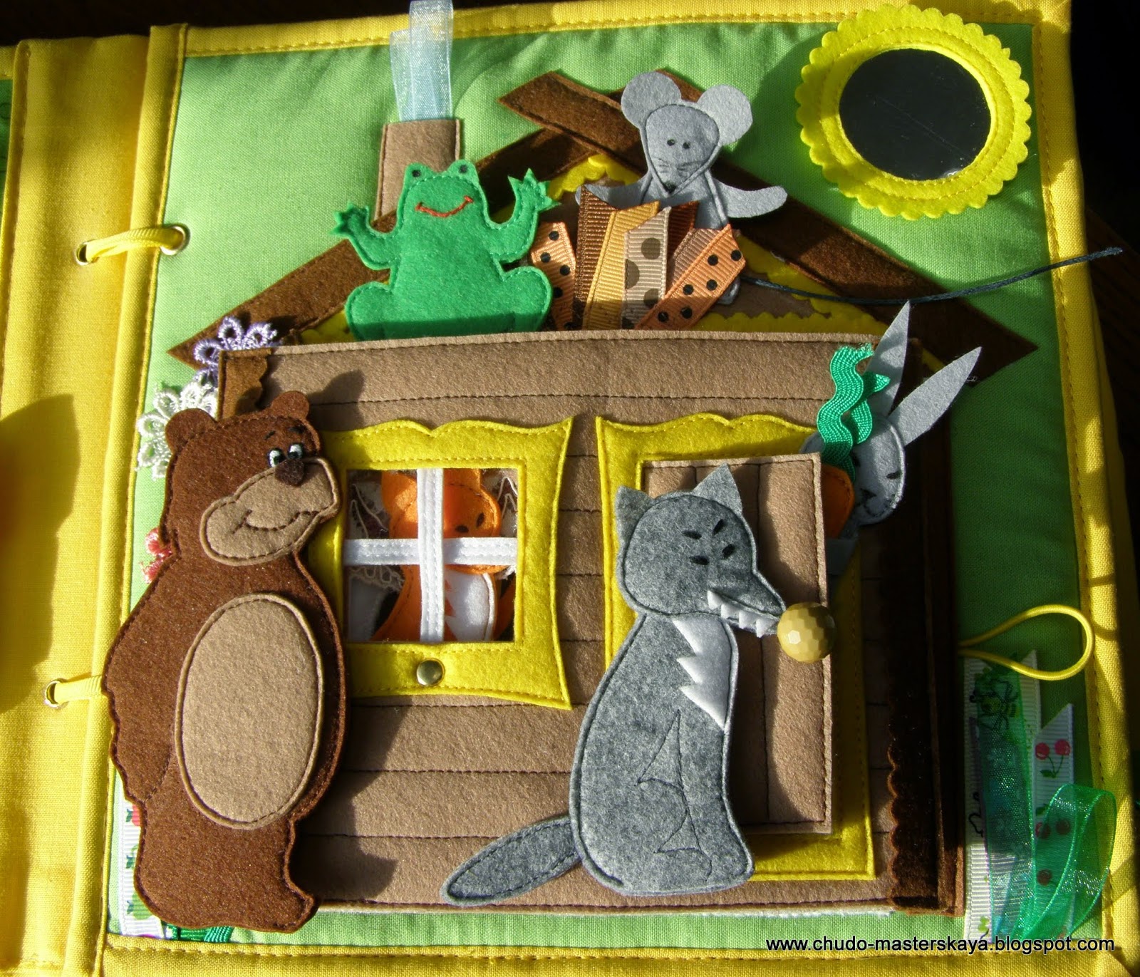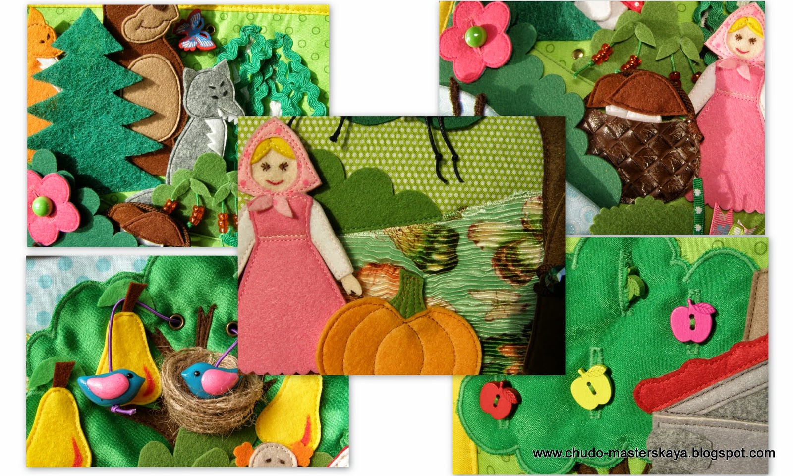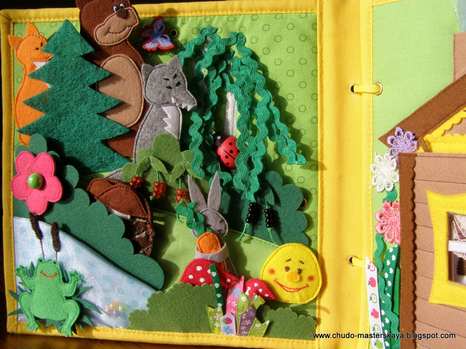 Мама Полиночки подчеркнула, что ей нравится использование разнофактурных материалов в развивающей книжке. Поэтому, где это было возможно, я старалась заменить фетр на другие материалы: ёлочка- жесткая губка, озеро - гладкая органза, кружевные цветочки у дома, рельефный кожзам, мешковина в домике Сороки, креп-сатин на деревьях разной стороной.