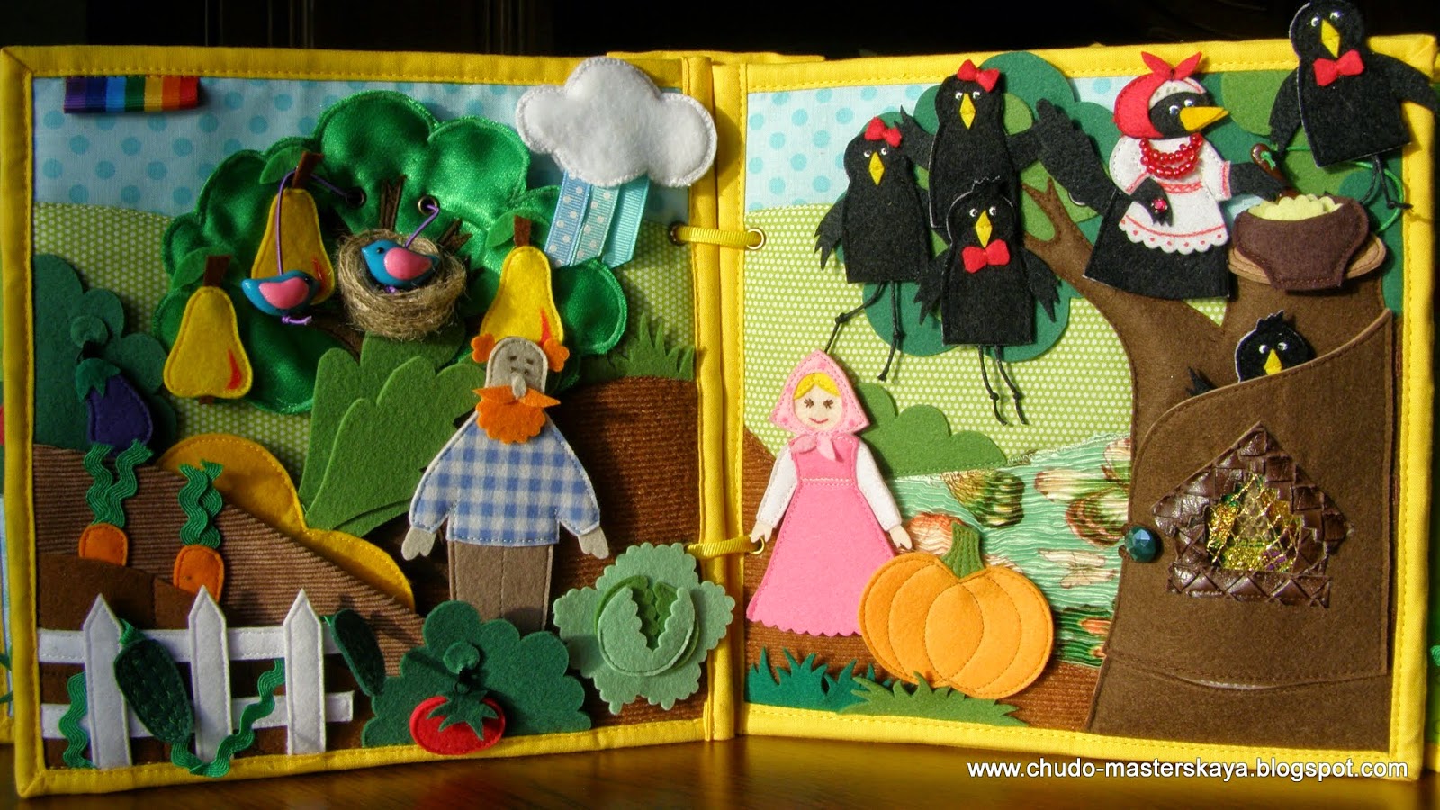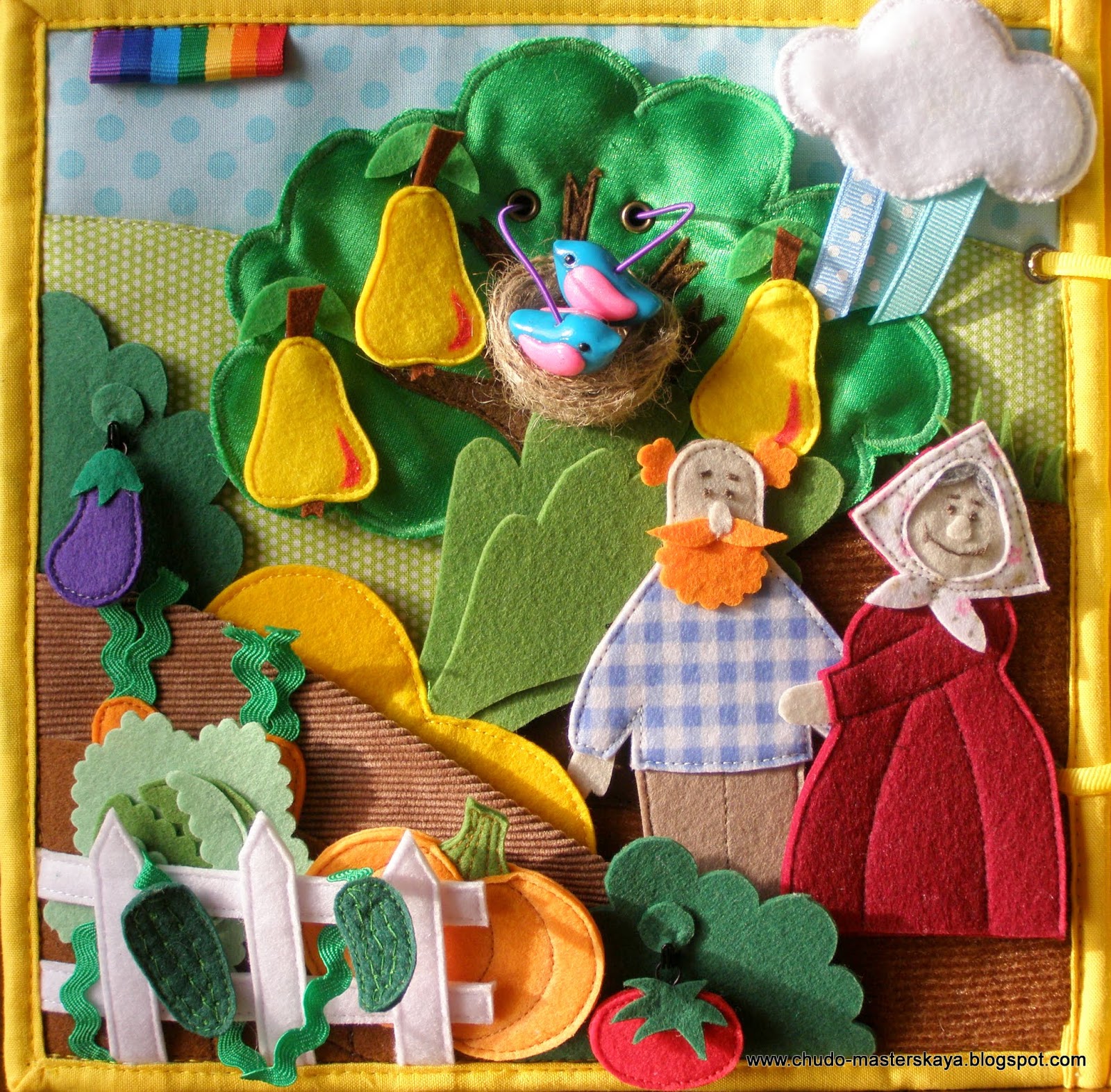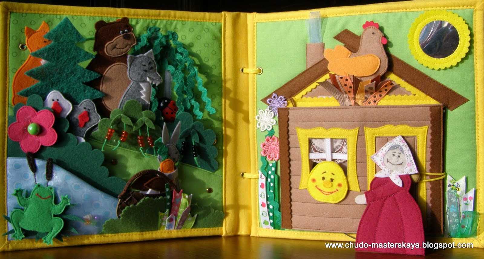 Мама Полиночки подчеркнула, что ей нравится использование разнофактурных материалов в развивающей книжке. Поэтому, где это было возможно, я старалась заменить фетр на другие материалы: ёлочка- жесткая губка, озеро - гладкая органза, кружевные цветочки у дома, рельефный кожзам, мешковина в домике Сороки, креп-сатин на деревьях разной стороной.