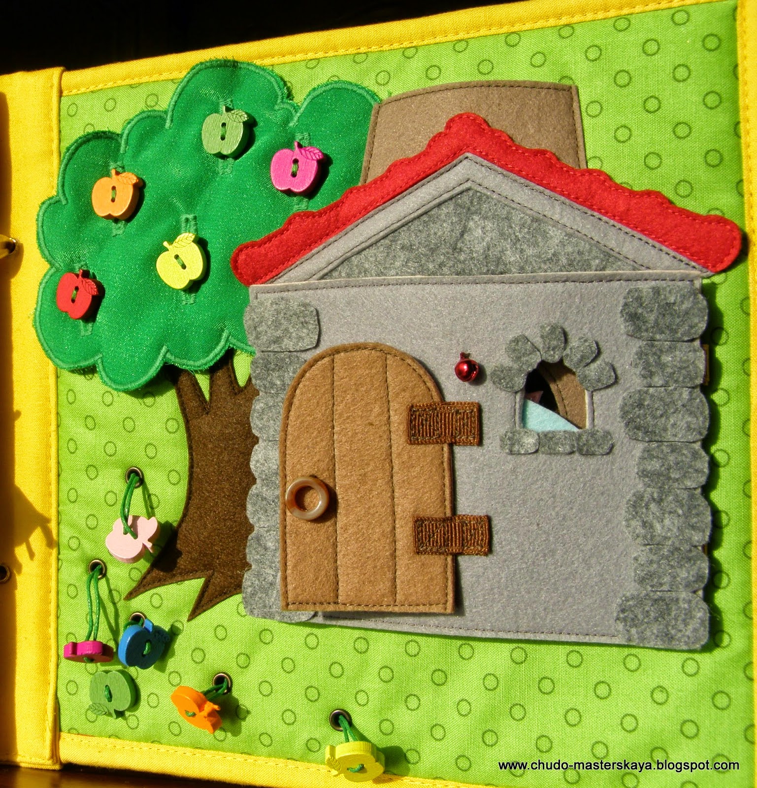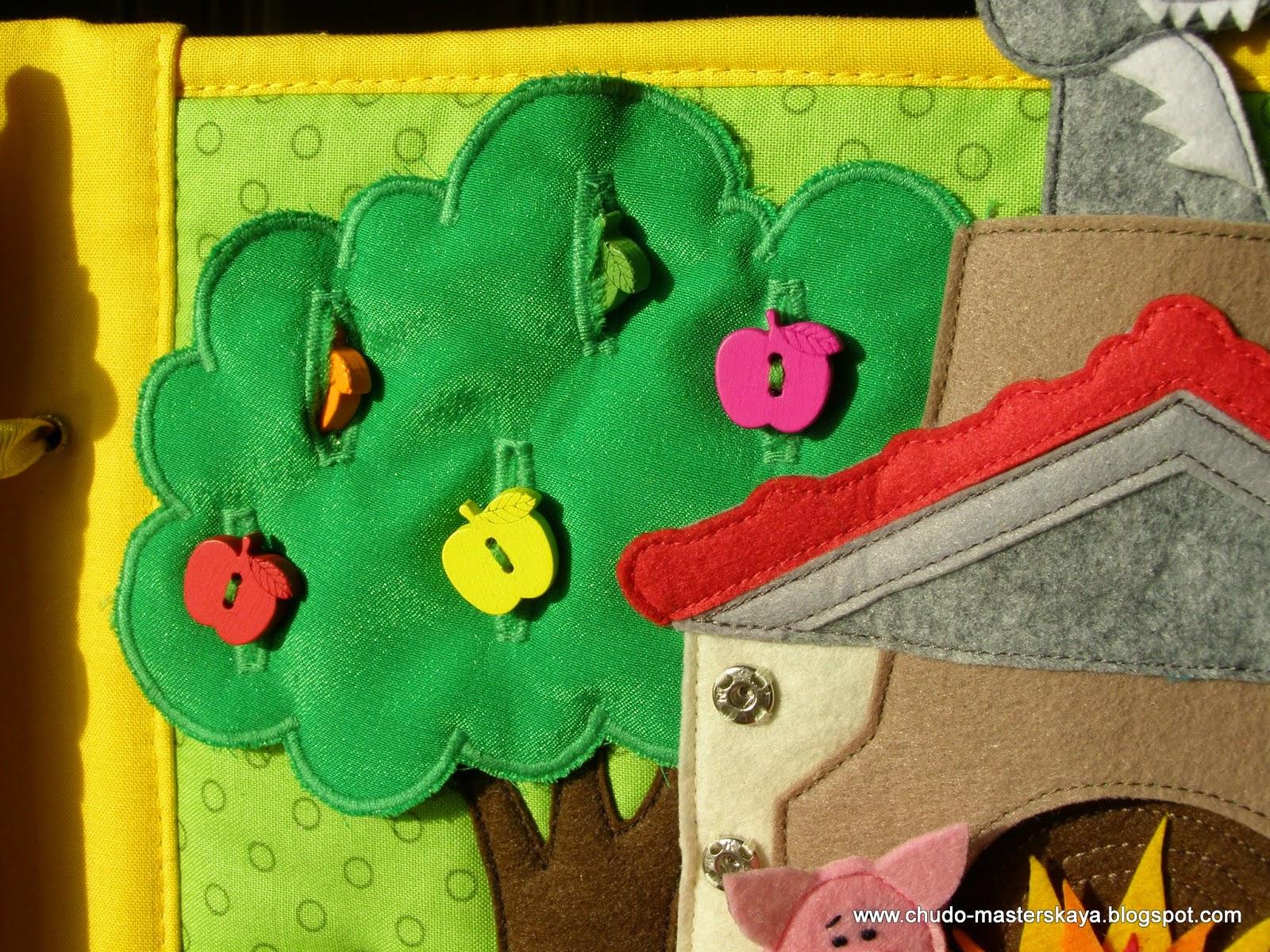 У дома растёт яблоня. Она служит не только отличным тренажером для пальчиков, чтобы учиться справляться с пуговками на прорезных петлях, на ней ещё удобно учиться считать, и давать ребенку простые задачки на сложение и вычитание.