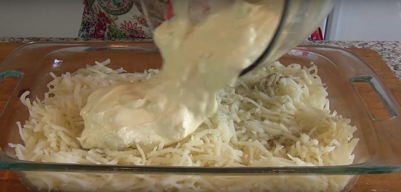 Выложи на дно формы тертый на крупной терке картофель, добавь соль и перец.