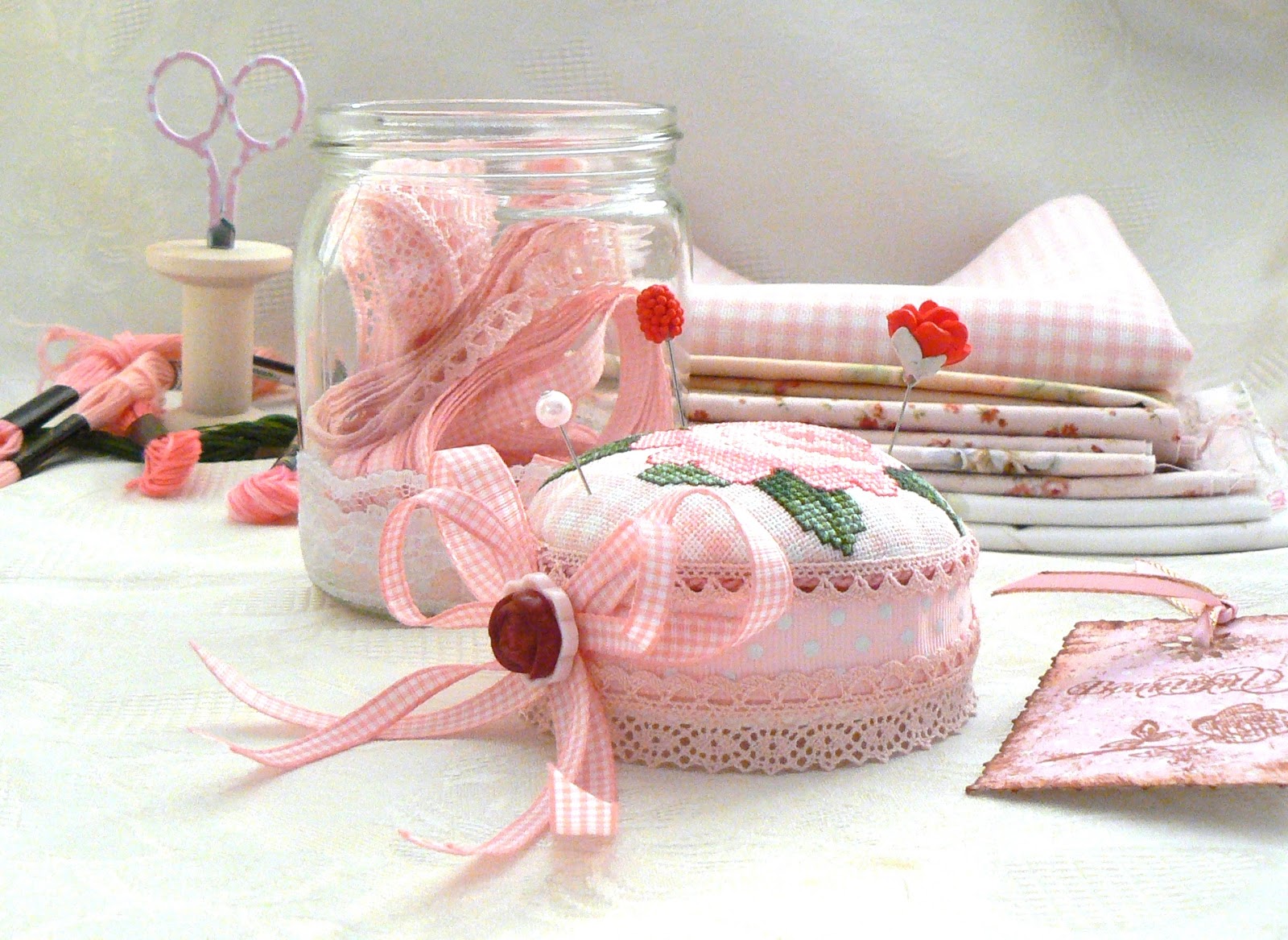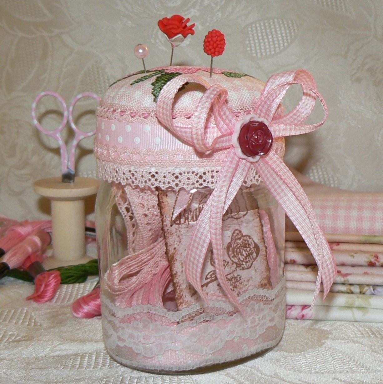 В баночке сложены кружавчики-ленточки для последующих этапов проекта"элегантность".