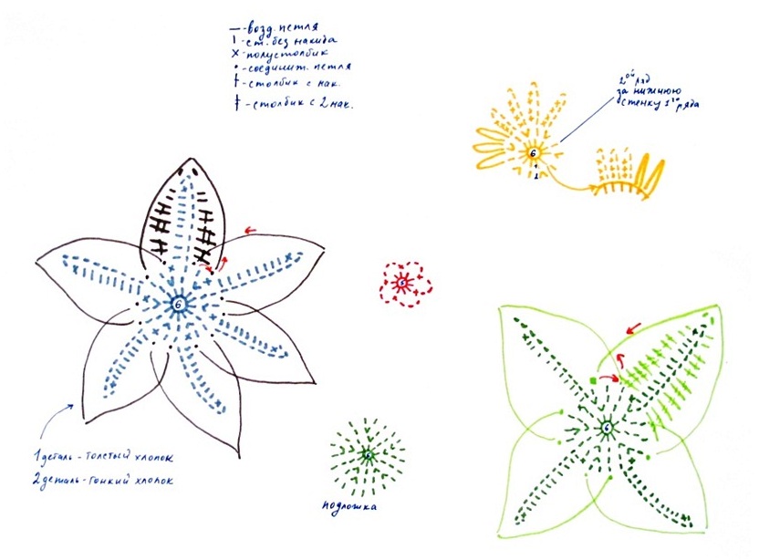 Необходимо связать 6 деталей: зеленые листья, зеленую подложку, желтую серединку, терракотовую серединку и 2 детали белых лепестков, одна (большая) из "Нарцисса", вторая, (поменьше) - из "Ириса".