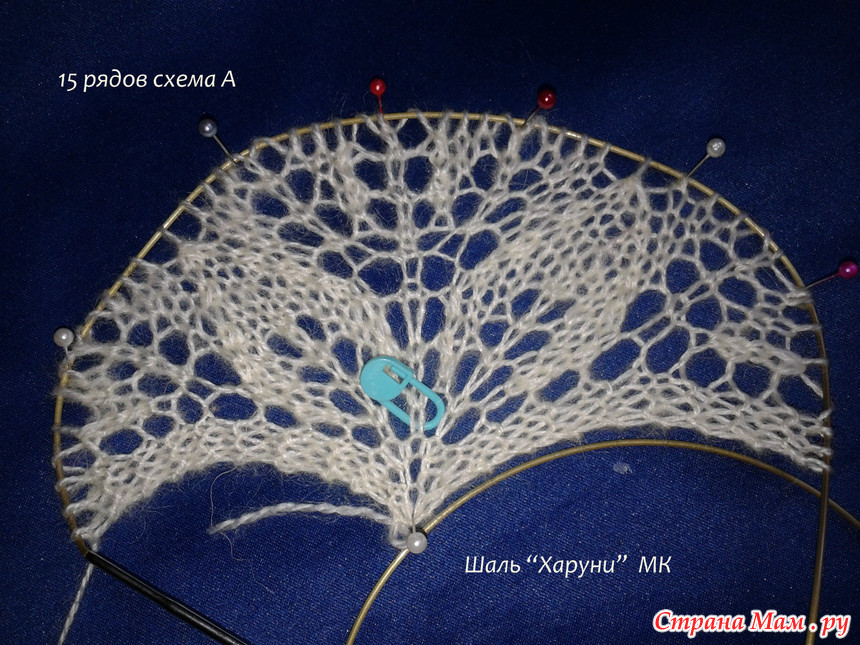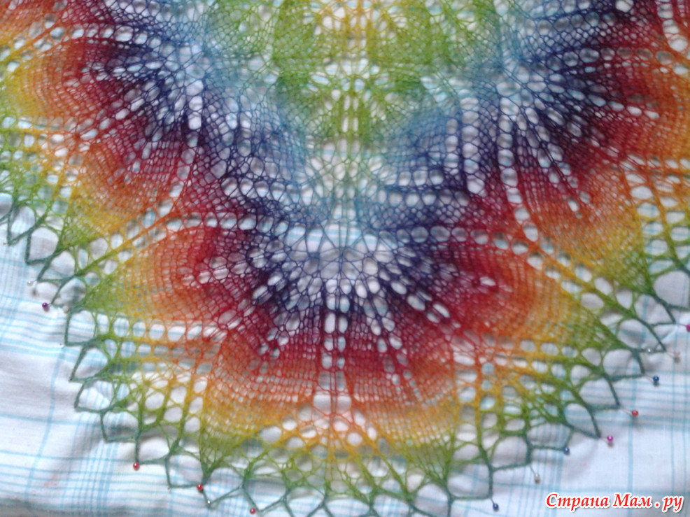 Блокировка. Спрятать концы нитей, намочить и растянуть шаль, придав ей треугольную или слегка серповидную форму.