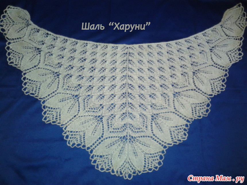 Харуни - треугольная шаль слегка серповидной формы. Она начинается уменьшенной версией традиционного ажурного узора «папоротник», который переходит в пышную лиственную кайму и заканчивается закрытием петель крючком. Название Харуни в переводе с квенья (эльфийскогоязыка в произведенияхТолкиена) означает "бабушка".