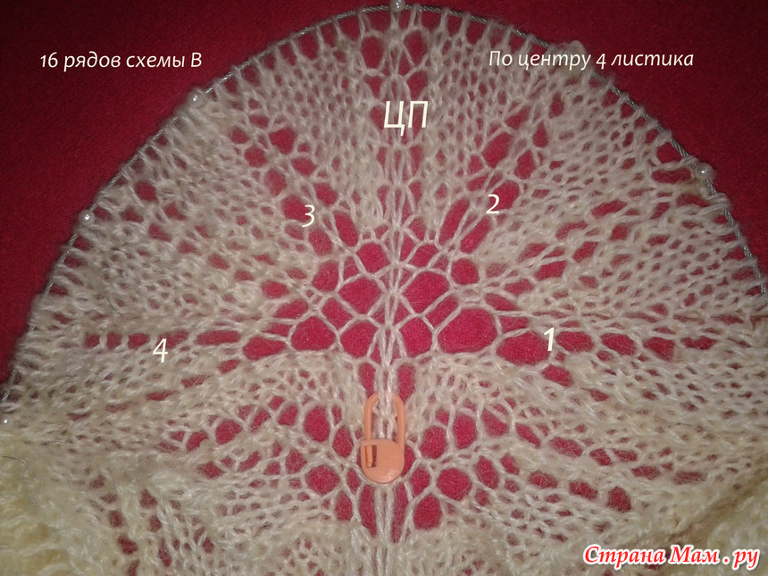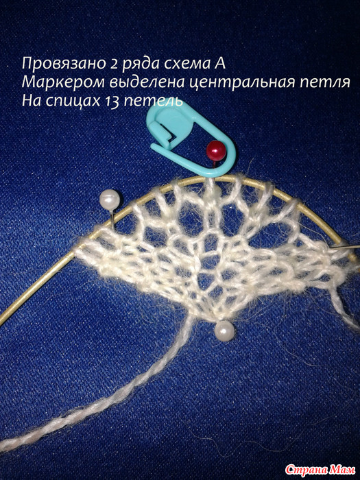 В пятом ряду количество накидов увеличивается до 8, между ними по 1 лицевой. Там где центральная петля - 16 накидов ( 8 накидов до центральной и 8 накидов после центральной петли)