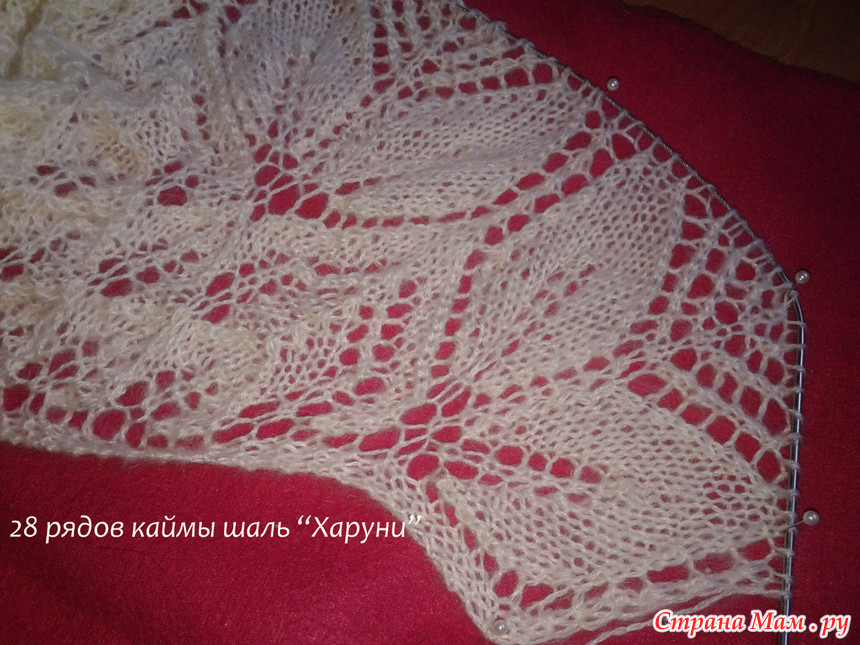•1 снять, нить перед работой, 2 лиц. Снимайте первую петлю очень свободно, это позволит позже правильно растянуть шаль. При желании первую петлю можно не снимать, а провязывать. Повторить этот ряд еще 5 раз.