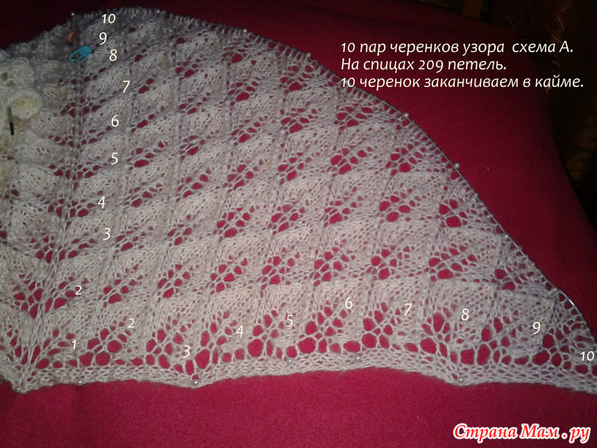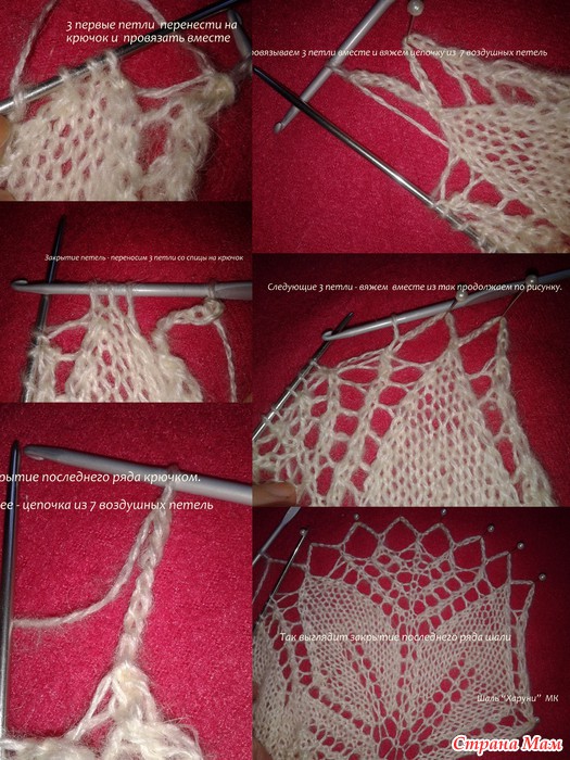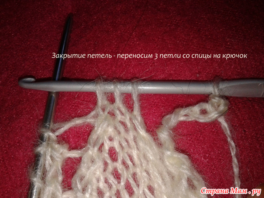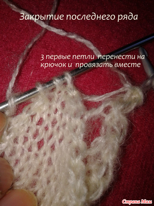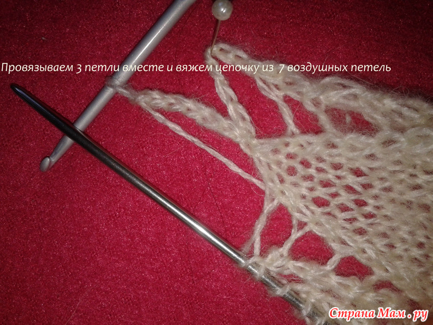 1-ый снять, 2 лиц., *накид, лиц, накид, лиц, накид, лиц, накид,2 вместе протяж. (первую снимаем, вторую провязываем лиц. и протягиваем через первую), 2 лиц, накид, 2 вместе протяж. (первую снимаем, вторую провязываем лиц. и протягиваем через первую), накид, лиц, из трёх одну лицевую, лиц, накид, два вместе лиц, накид, 2 лиц, 2 вместе лиц*