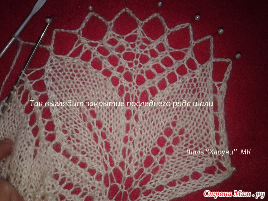 1 ряд... (смотри на схему) где галочка, эту снимаем (кромочная), потом 2 лицевых, *накид, лиц, накид, 2 вместе протяж. (первую снимаем, вторую провязываем лиц. и протягиваем через первую), 2 лиц, накид, 2 вместе протяж. (первую снимаем, вторую провязываем лиц. и протягиваем через первую), накид, 2 лиц, 1 петлю провязываем лиц. и протягиваем через две снятые (из трёх петель надо сделать одну ), 2 лиц, накид, 2 вместе лиц., накид, 2 лиц., 2 вместе лиц.*