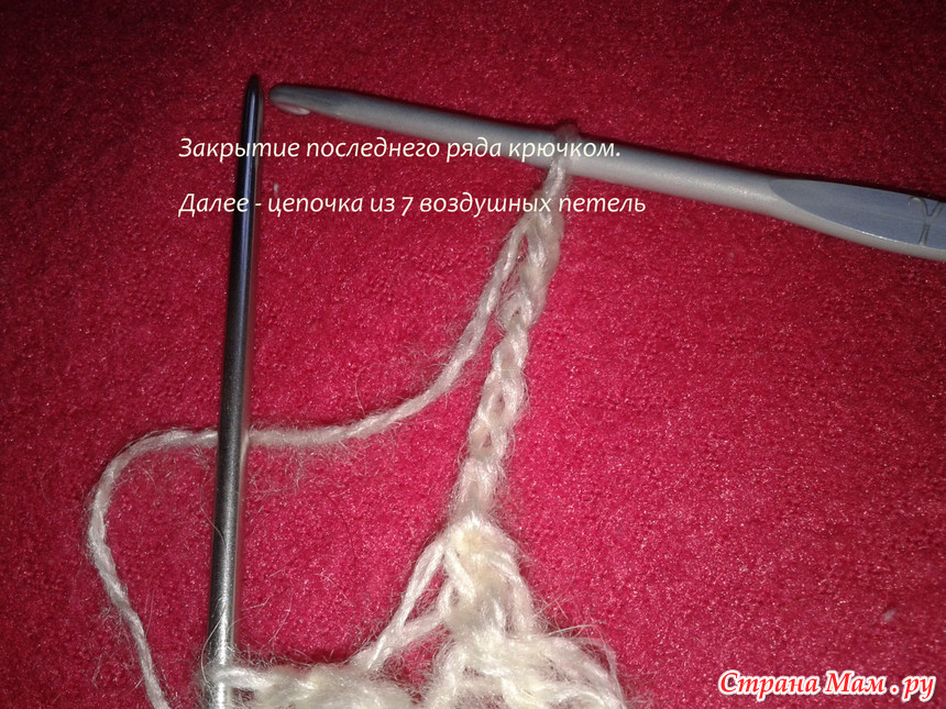 После последнего ряда (изнаночная сторона изделия) можно закрывать петли. Предлагается два варианта (крючок или шнур), во втором варианте расходуется больше пряжи. Для тонкой пряжи рекомендуется либо второй вариант, либо первый в две нити.