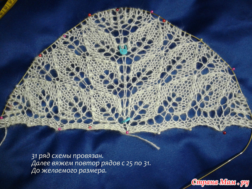 25 ряд - 3 лиц., накид, 1 лиц., накид, 2 вместе протяж. (первую снимаем, вторую провязываем лиц. и протягиваем через первую), 5 лиц, 2 вместе лиц., накид, 1 лиц накид, 2 вместе протяж. (первую снимаем, вторую провязываем лиц. и протягиваем через первую), 5 лиц., 2 вместе лиц., накид, 1 лиц, накид, 2 вместе протяж. ( первую снимаем, вторую провязываем лиц. и протягиваем через первую), 5 лиц., 2 вместе лиц., накид, 1 лиц., накид, 1 лиц (ЦП), накид, 1 лиц., накид, 2 вместе протяж. (первую снимаем, вторую провязываем лиц. и протягиваем через первую), 5 лиц, 2 вместе лиц., накид, 1 лиц накид, 2 вместе протяж. (первую снимаем, вторую провязываем лиц. и протягиваем через первую), 5 лиц., 2 вместе лиц., накид, 1 лиц, накид, 2 вместе протяж. (первую снимаем, вторую провязываем лиц. и протягиваем через первую), 5 лиц., 2 вместе лиц., накид, 1 лиц., накид, 3 лиц.