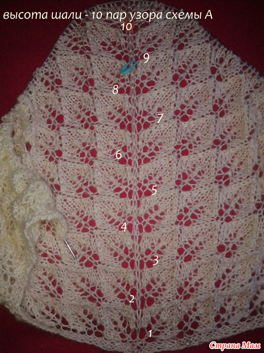 Продолжить вязать по схеме А, пока не получится по 12 "черенков" с каждой стороны центральной петли, то есть 11,5 листиков (то есть повторить 17-32 ряды еще 4 раза, на схеме раппорт выделен желтым цветом). "Черенок" - это одиночная лицевая петля с накидами с обеих сторон от нее. Если вы хотите увеличить или ульенъшить шаль, нужно закончить схему А четным количеством "черенков" в каждой половине.