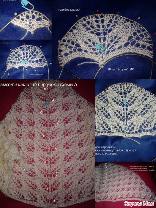 21 п. х 18 р. = 10 х 10 см ажурным узором, после обработки. Плотность вязания для шалей не имеет существенного значения.