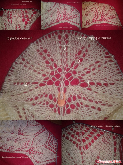 17 ряд - кромочная, 1лиц., 2вместе протяжкой, накид, 2вместе лиц. протяжкой, 11 лиц., 2 вместе лиц., накид, 3 лиц., накид, 2 лиц. вместе протяжкой, 11 лиц., 2 снять,1 лиц. протяжка, *накид, 2 снять,1 лиц. протяжка, накид, 2 снять, 1 лиц. протяжка,11 лиц., 2 вместе лиц., накид, 3 лиц., накид, 2 лиц. вместе протяжкой, 11 лиц., 2 снять,1 лиц. протяжка, *... перед центральной вместо 2 снять,1 лиц. протяжка я вязала 2 вместе, накид, лиц., накид, центр. петля, накид, 1 лиц., накид и далее повтор от * до * до конца ряда, лишь в самом к