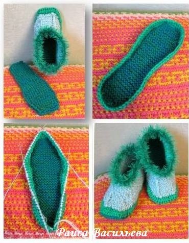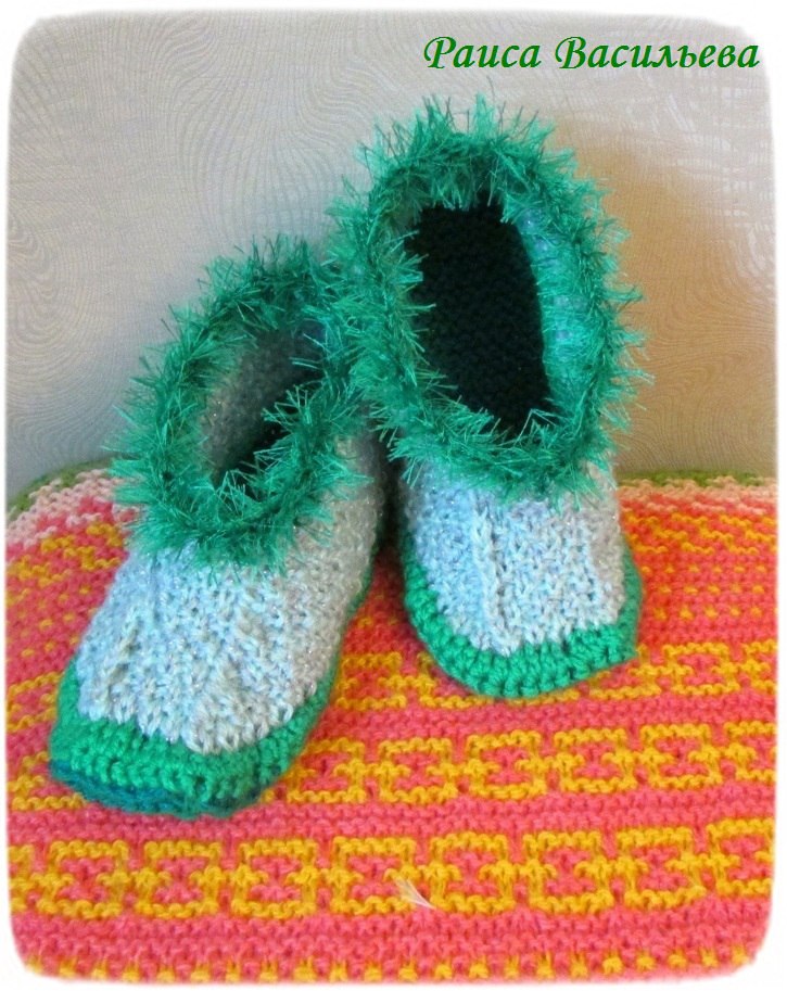 Подошву вязала нитью в 2 сложения на спицах 3,5. (Из-за того, что петли толстыми нитками объёмные, получается массажный эффект!)