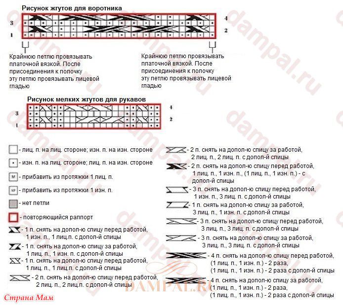 Связать 14.5 (15, 15, 15, 16, 16, 16.5, 16.5) см рисунком жгутов для воротника (СХЕМА 1), повторяя ряды 1-4 раппорта, закончить изнаночным рядом (рисунок 1).