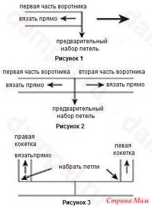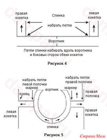 Круговыми спицами по лицевой стороне набрать и провязать 25 (26, 27, 29, 30, 30, 30, 30) петель вдоль длинного края левой кокетки до соединения с воротником, 38 (40, 42, 42, 46, 46, 48, 48) петель вдоль края воротника до соединения с правой кокетки, 25 (26, 27, 29, 30, 30, 30, 30) петель вдоль длинного края правой кокетки до держателя петель (рисунок 4) – всего на спицах 88 (92, 96, 100, 106, 106, 108, 108) петель.