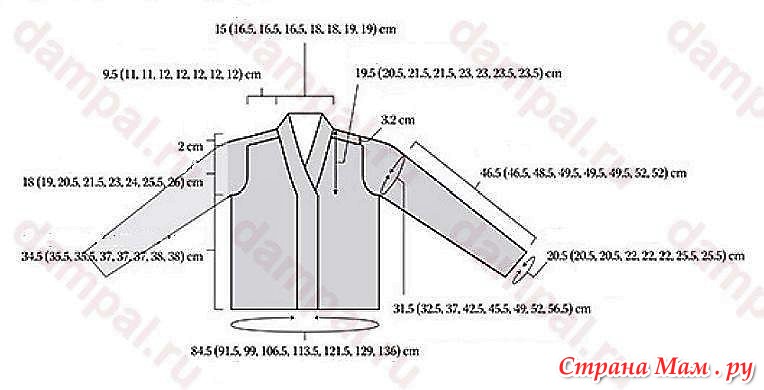 Связать в установленном порядке 28 (29, 29, 30.5, 30.5, 30.5, 31.5, 31.5) см от проймы, закончить изнаночным рядом.