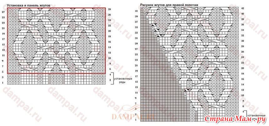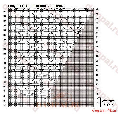 Установочный ряд (изнаночный): 8 (9, 10, 12, 13, 13, 13, 13) лицевых петель, маркер, вязать петли 1-го ряда рисунка жгутов для левой полочки до маркера, вязать петли в установленном порядке.