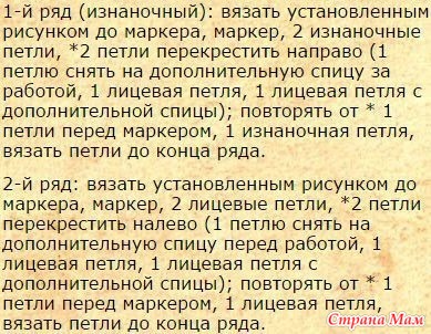 Следующий ряд (лицевой): 1 лицевая петля, петли 2-го ряда рисунка мелких жгутов для рукавов, 1 лицевая петля.