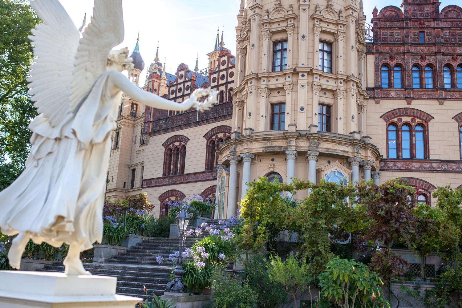 Вокруг замка раскинулся уникальный парковый комплекс. Этот сад построен в классических традициях английского стиля. Здесь множество тенистых рощ и террас, оранжерей, а скалистые гроты на берегу Шверинского озера создают настоящую атмосферу старинного замка.