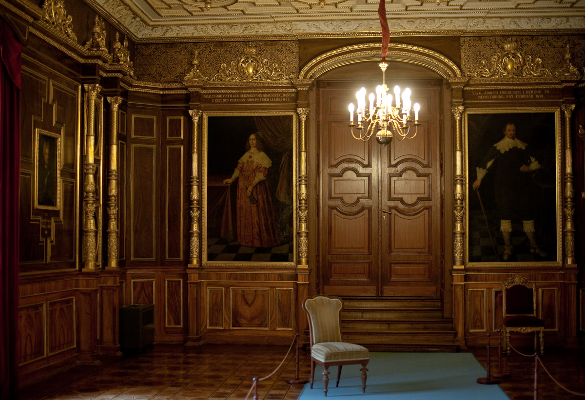 На 3-х этажах замка располагались комнаты великих герцогов разных времен. Кроме того, во дворце был оборудован по-настоящему роскошный тронный зал. Знаменит замок и своей галереей фамильных портретов из династии Мекленбург.