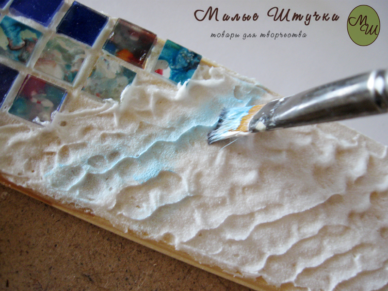 А теперь краской цвета лазурного залива разукрашиваем волны. Но помним, что море - штука переменчивая, и редко бывает однородным. Так что здесь можно побаловаться и оформить в одном месте рамочки океанический шторм, а в другом - райскую лагуну: