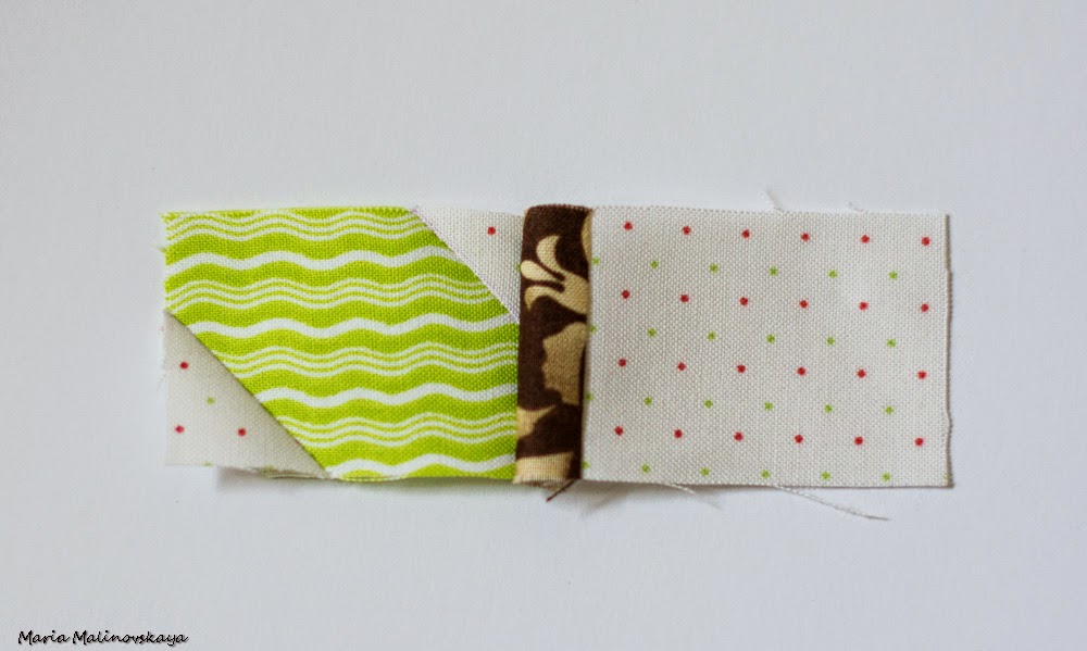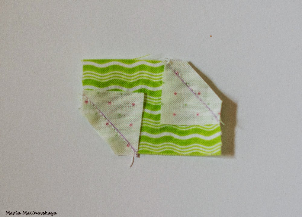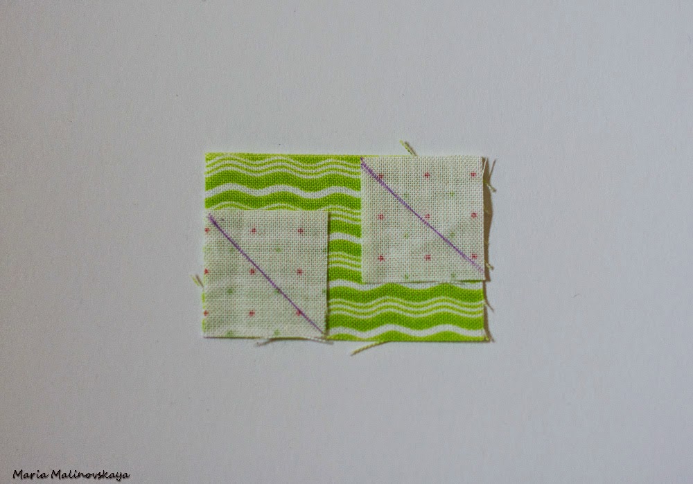 Практически так же шьется листик. На квадратиках 1Х1 дюйм рисуем диагонали и так же пришиваем их к зеленой ткани. Внимание: следите за направлением листика. если хотите, чтобы он смотрел налево, как у меня, пришивайте квадратики к левому нижнему и правому верхнему углам.