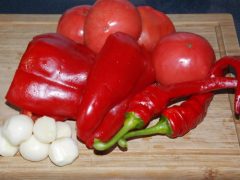 Фото 1. Беру по 2 килограмма перца сладкого и помидор спелых мясистых, потом 200 граммов чеснока, пять острых перцев, соль, сахар по вкусу и 1 стол. ложку 70%уксуса.
