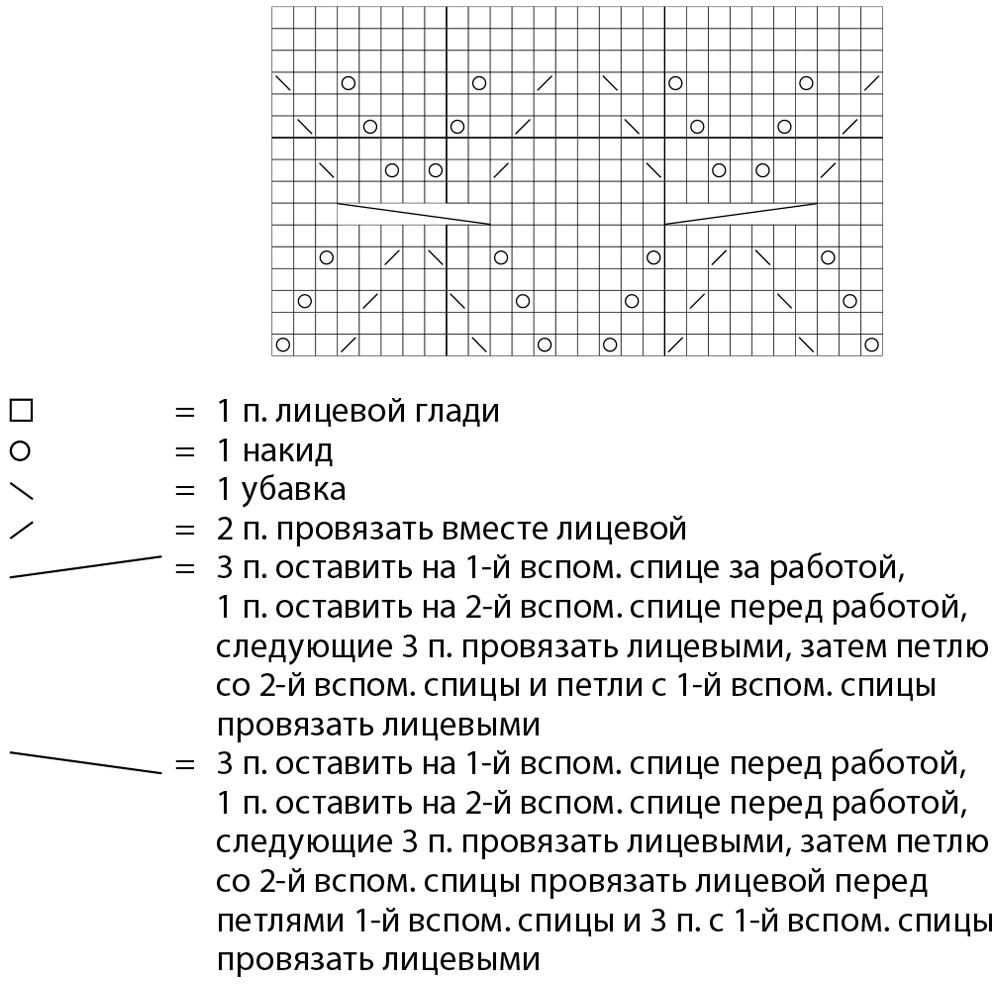 В следующем лиц. ряду вязать до 2 п. перед «косой», выполнить 1 убавку, провязать первые 13 п. «косы», 1 лиц. (= первая из 2 средних петель на схеме).