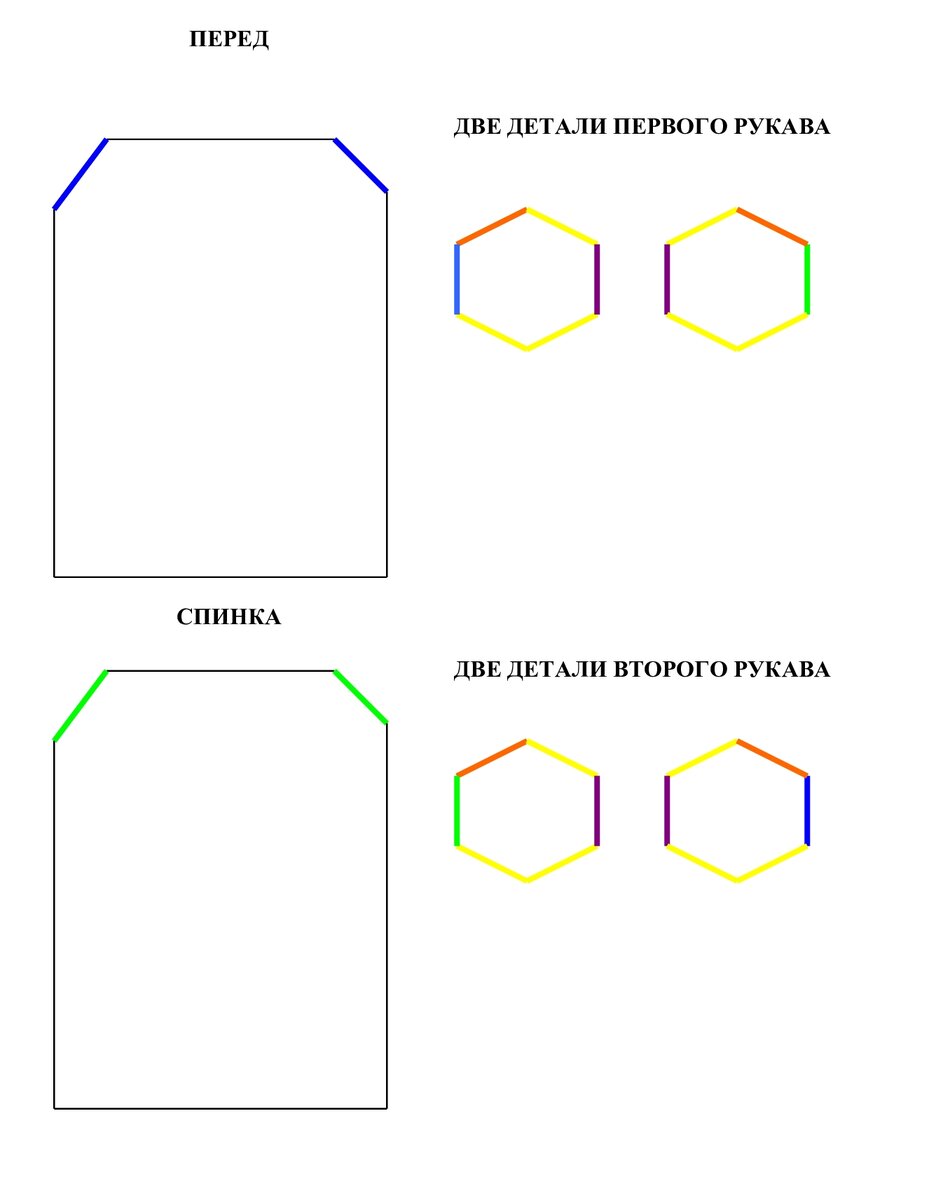 Перед и спинка вяжутся снизу вверх как прямоугольники. Вверху делаем вырез для рукава. по длине этот отрезок должен соответствовать одной стороне шестиугольника (рукава).
