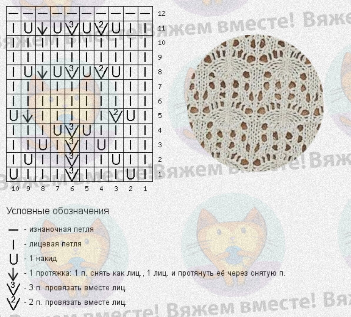 Раппорт узора — 10 петель и 12 рядов. Обратите внимание, что на схеме обозначены как лицевые, так и изнаночные ряды узора. В нижней половине раппорта накиды и убавления выполняются в каждом ряду.