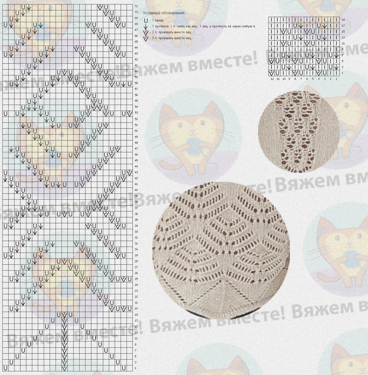 Чтобы узор получился симметричным, двойные убавления (обозначены галочкой с цифрой три) провязывать так, чтобы центральная петля лежала сверху.