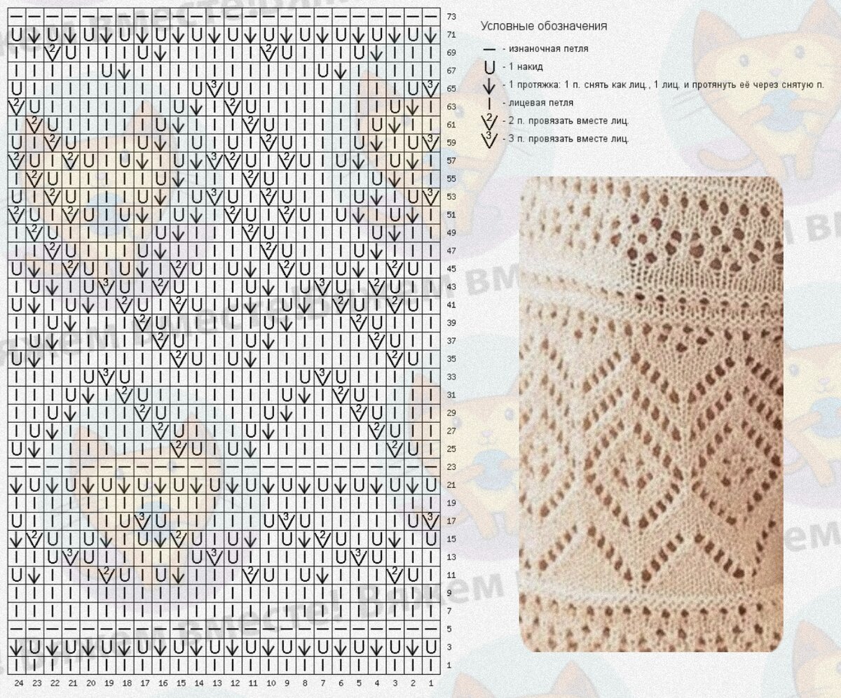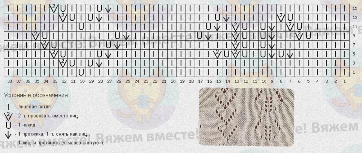 На схеме даны один раппорт по высоте и два по ширине, и обозначены только лицевые ряды узора, изнаночные ряды вяжутся по рисунку петель на спице.