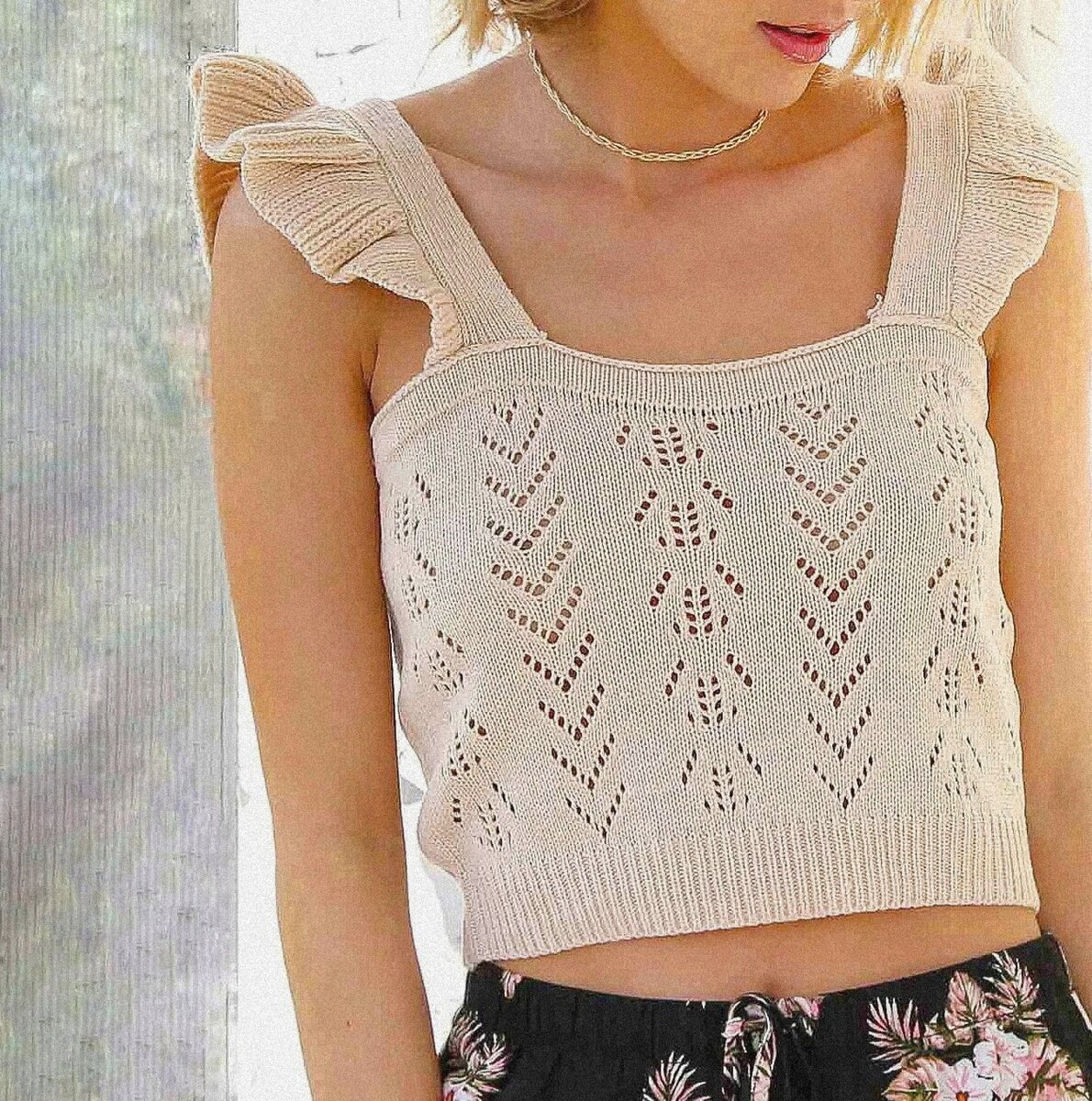 Не менее красивый топ с рюшами на лямках и очень простым ажурным узором, с которым справится даже новичок в вязании. Да и сама конструкция топа не вызовет сложностей.