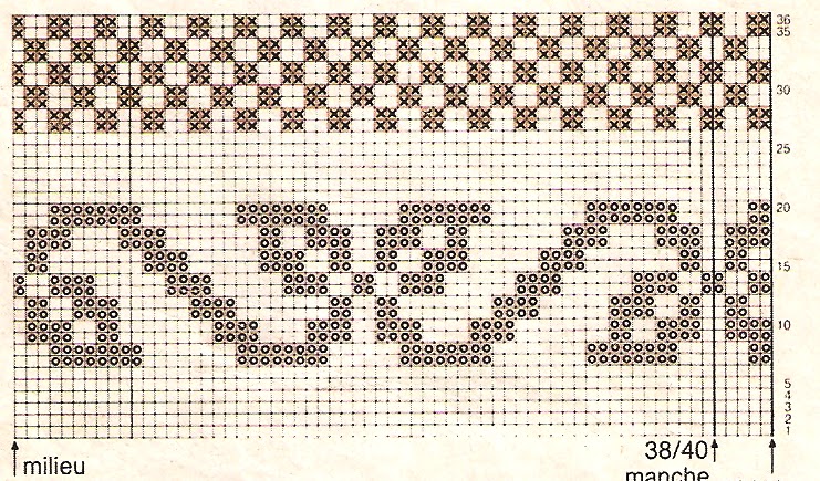 Продолжаем вязать жаккард по схеме. В схеме изображена половина узора, вторую половину вязать симметрично изображенной.