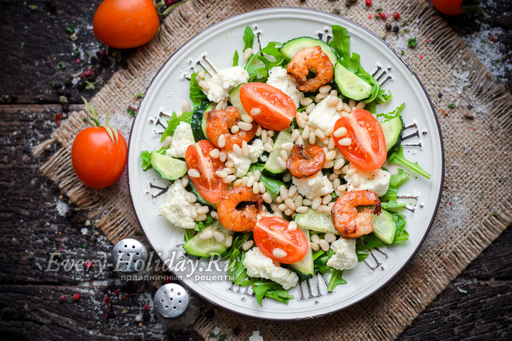 А вкус этого салата просто бесподобный - сочетание креветок и кедровых орешков, да еще и пикантная руккола, с тонким ореховым оттенком вкуса, плюс сыр – вкуснее не придумать!