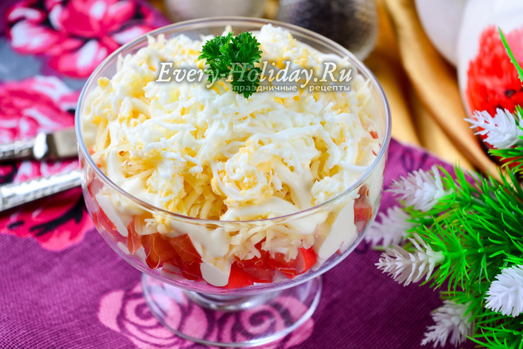 Этот салатик готовится с крабовыми палочками, но плюс ко всему с помидорами, яйцом и сыром. Сочетание этих продуктов даёт отличный результат!