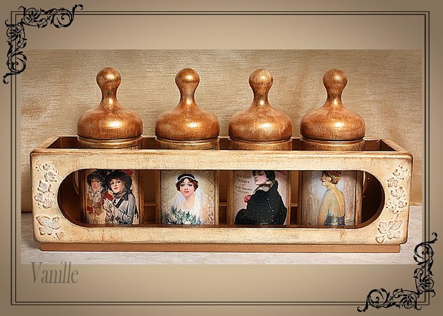Это было очень давно, но, вдруг, кому-то это пригодится! Для работы потребовалось: - старый набор деревянных банок для специи (были буковые) и короб для них - наждачная бумага (шкурка) - акриловый грунт, подходящий для дерева - лакированные струйные распечатки - трафарет подходящего орнамента - рельефная, текстурная или фактурная паста - акриловые краски: слоновая кость, белая, охра - акриловая краска "Старая Бронза" или просто "Бронза" - на ваш выбор - кракелюрная пара CREALL - масляная краска черная и коричневая - полироль "Антик" коричневый или другое средства для придания эффекта "антик" - лак финишный (у меня мой любимый Поли-Р!) Источник: