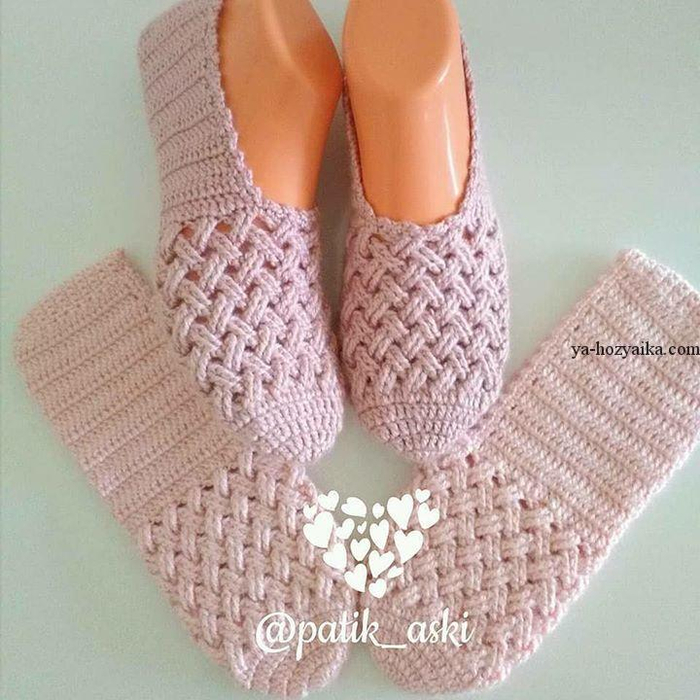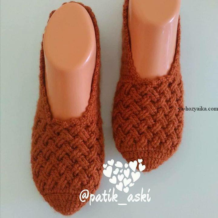 Мыс – 5 рядов как на шапку, только прибавок поменьше (ориентироваться на ширину стопы). Далее плетеный узор. У меня есть описание на поворотные ряды. Если помудрить, можно придумать, как вязать по кругу. Или вязать так, а потом сделать аккуратный шов на подошве. А дальше сбн или сн до нужной длины.