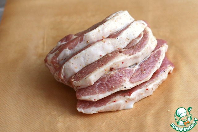 1. Свиная корейка, которую я нарезала вдоль до косточки, получилась вот такая гармошка, как видно на фото.