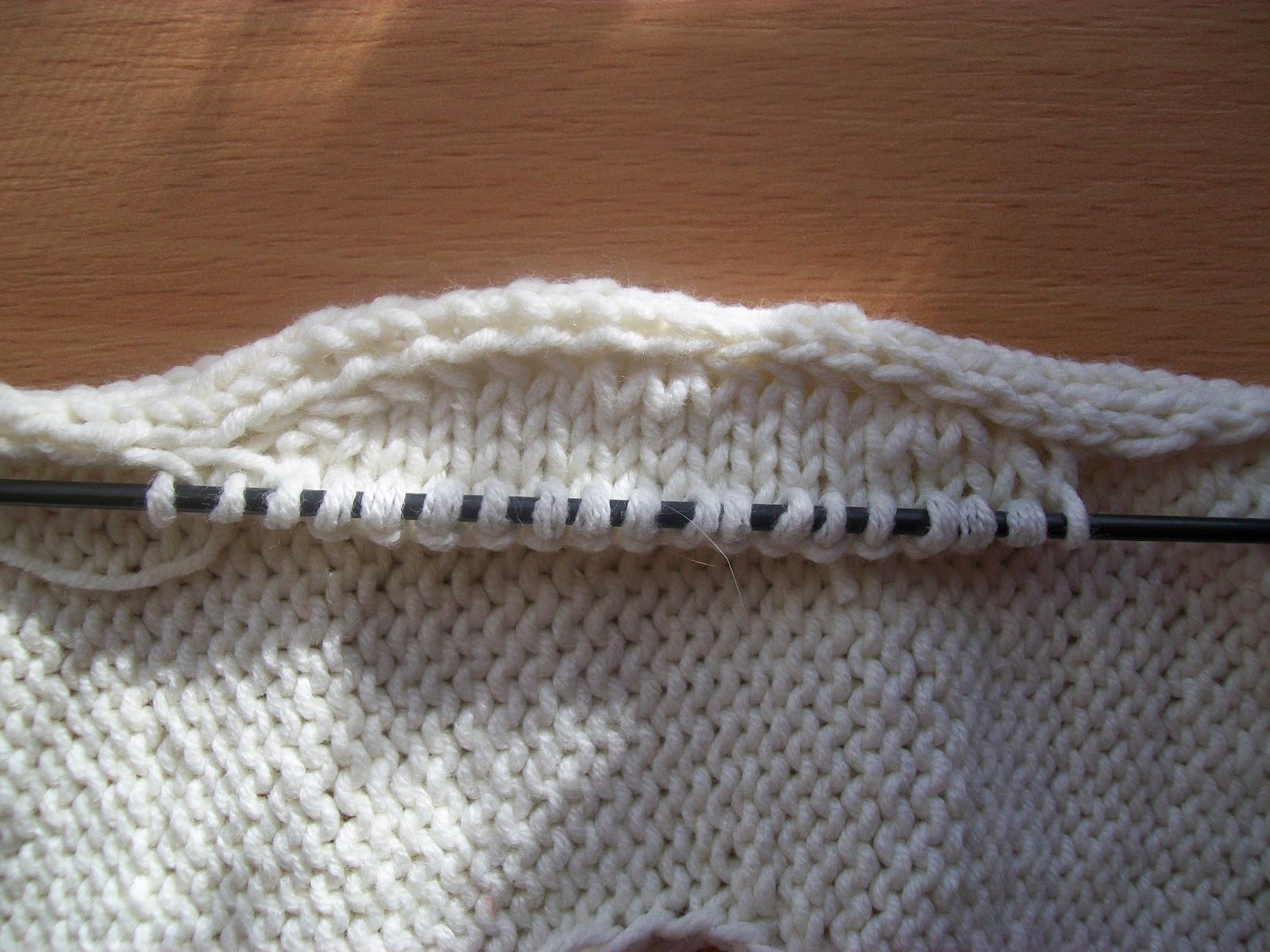 Продолжить вязание, поднимая петли из кромочных в лицевых и изнаночных рядах попеременно.