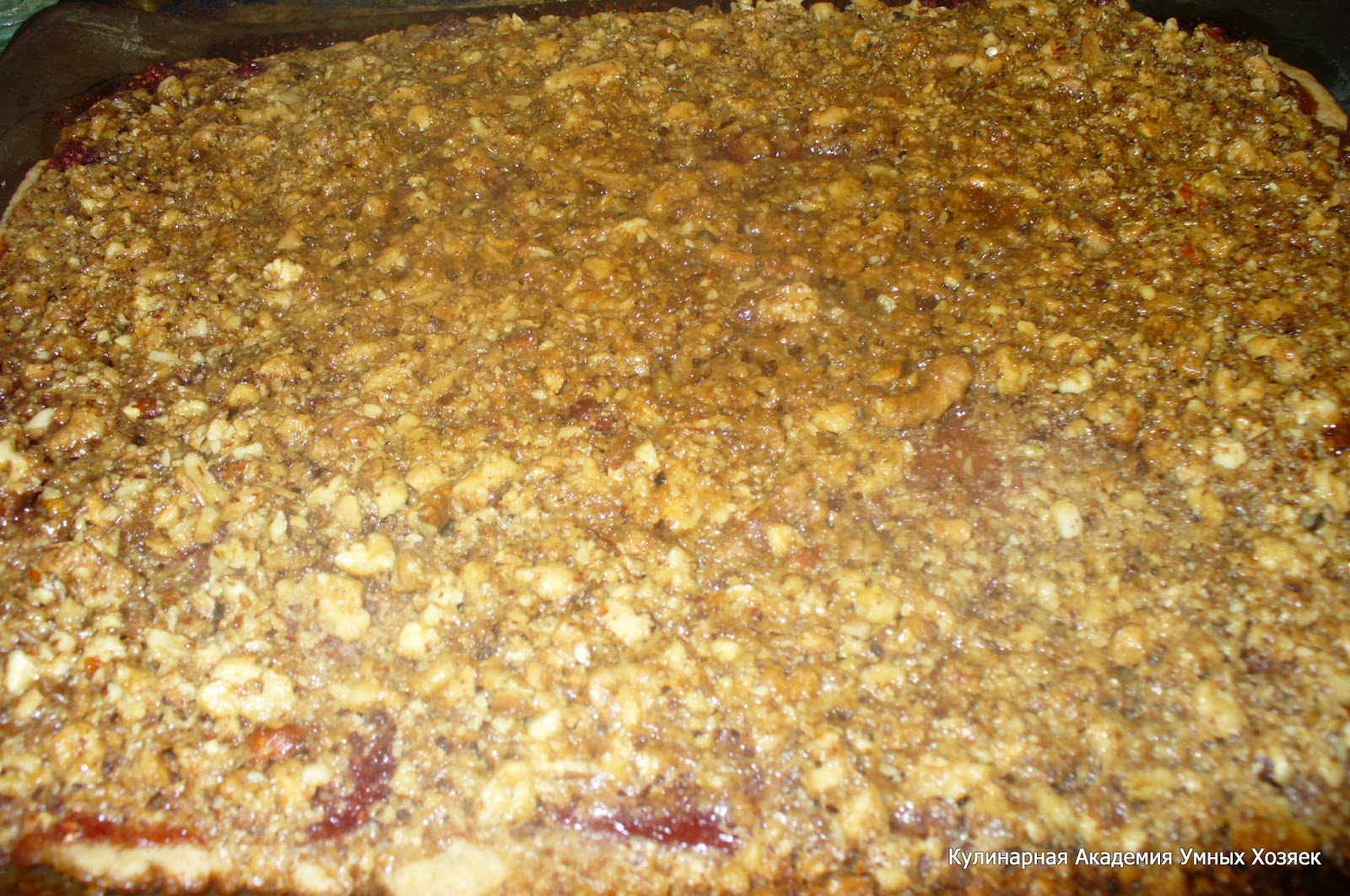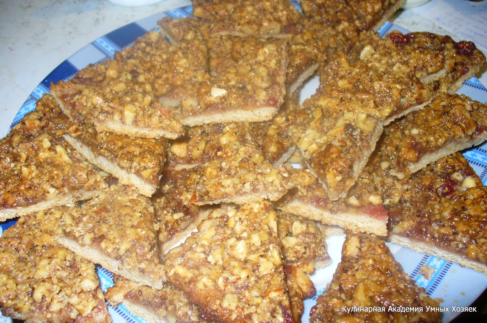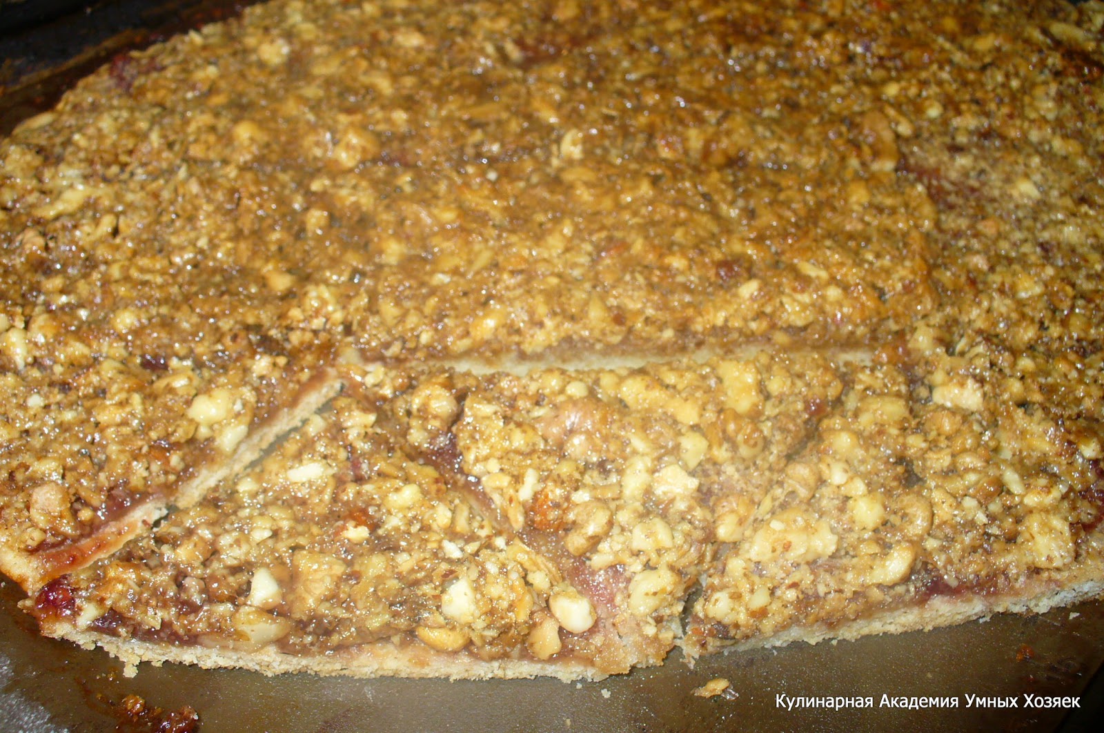 Не пересушите, печенье должно остаться мягким! Свежеиспеченный ореховый пласт, не остужая разрежьте сначала на полоски, затем полоски нарежьте на уголки.
