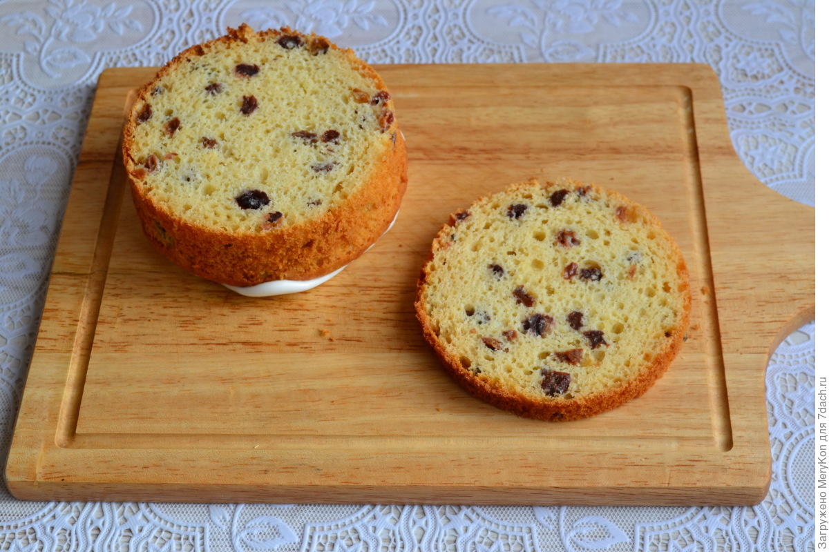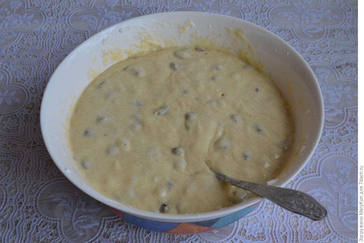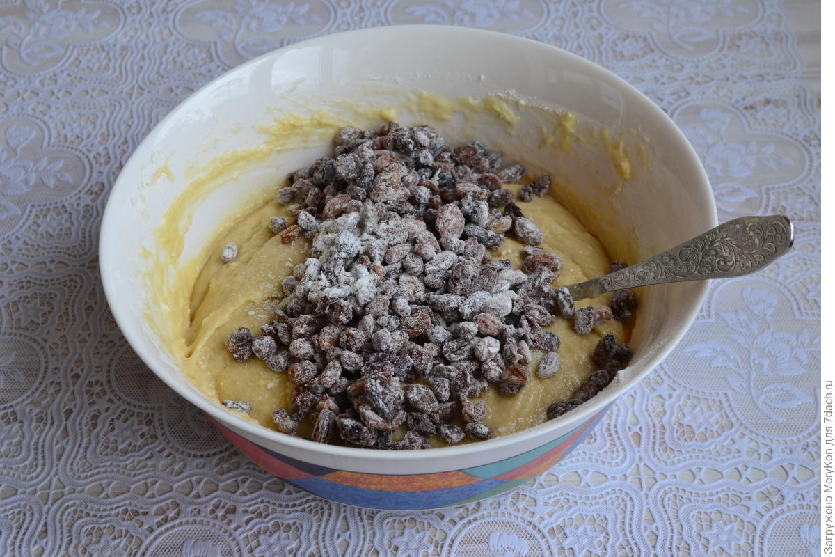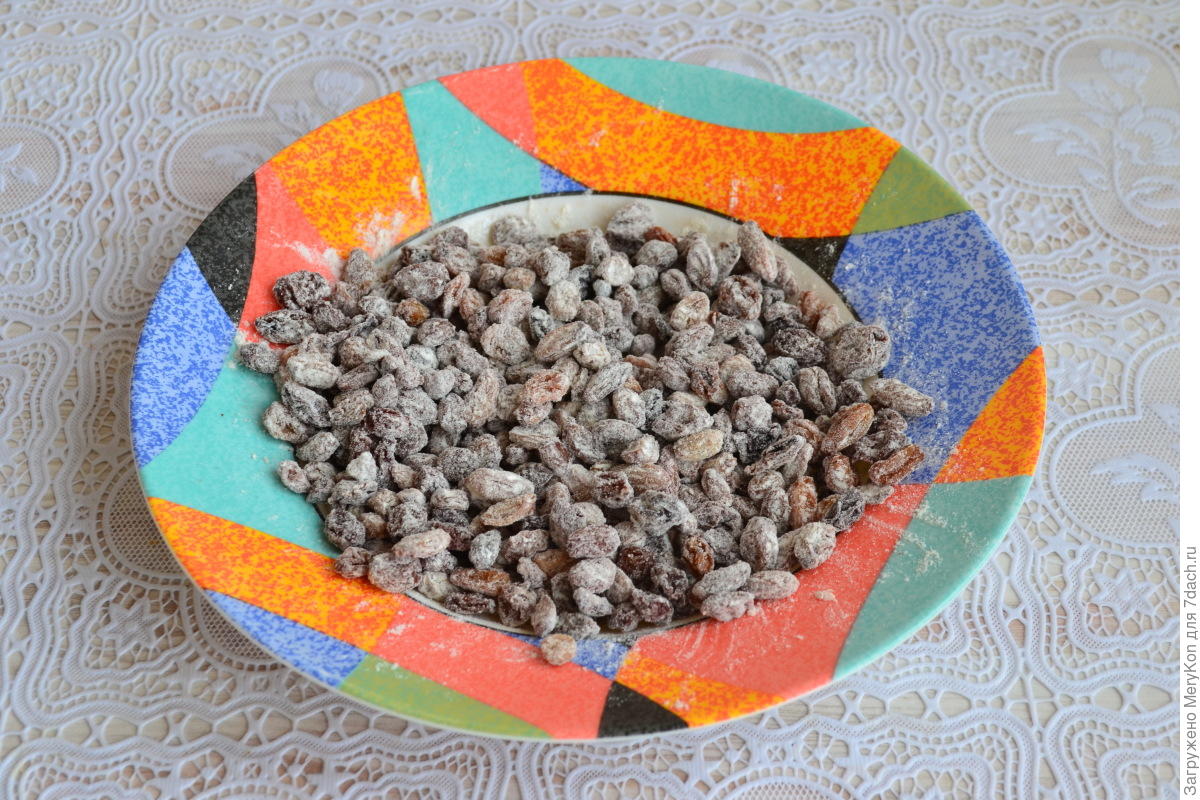 Изюм заливаем кипятком и оставляем на 5-7 минут. Затем хорошо промываем и сушим. Обваливаем, посыпав столовой ложкой муки для равномерного распределения в тесте. Кстати, изюм при желании можно на ночь замочить в коньяке, получится очень ароматно.
