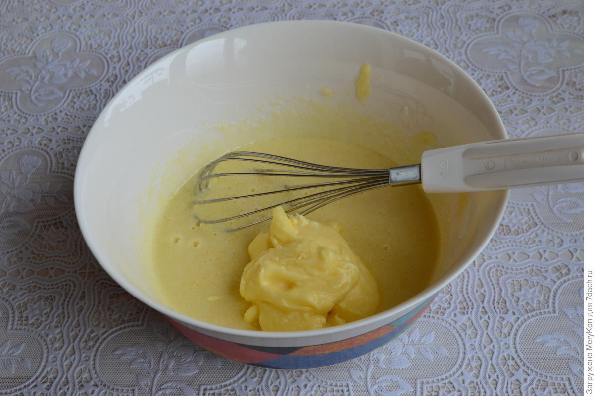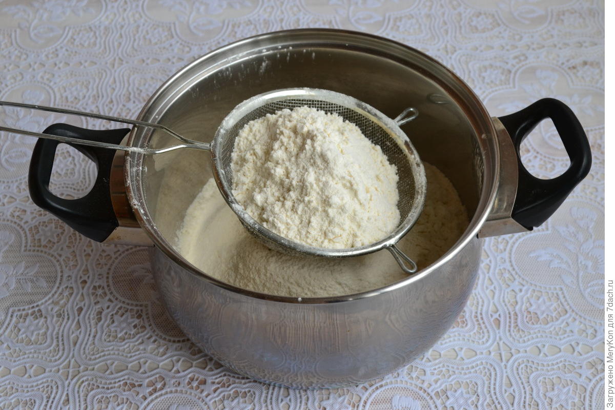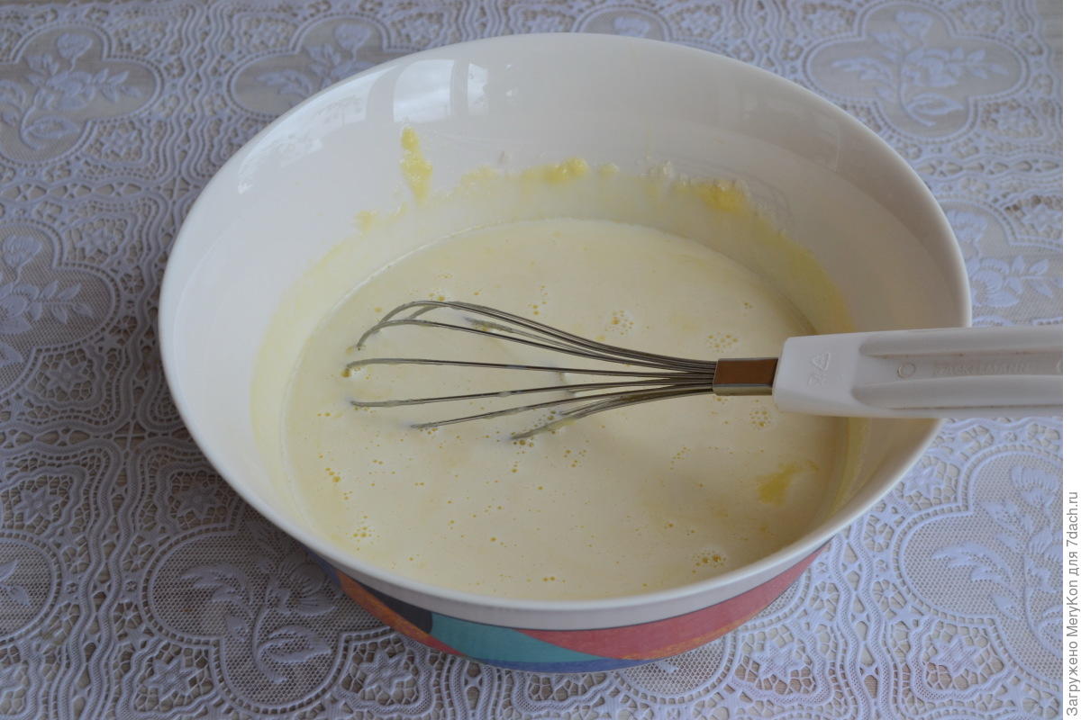 Добавляем теплое молоко (примерно 60 градусов), перемешиваем.