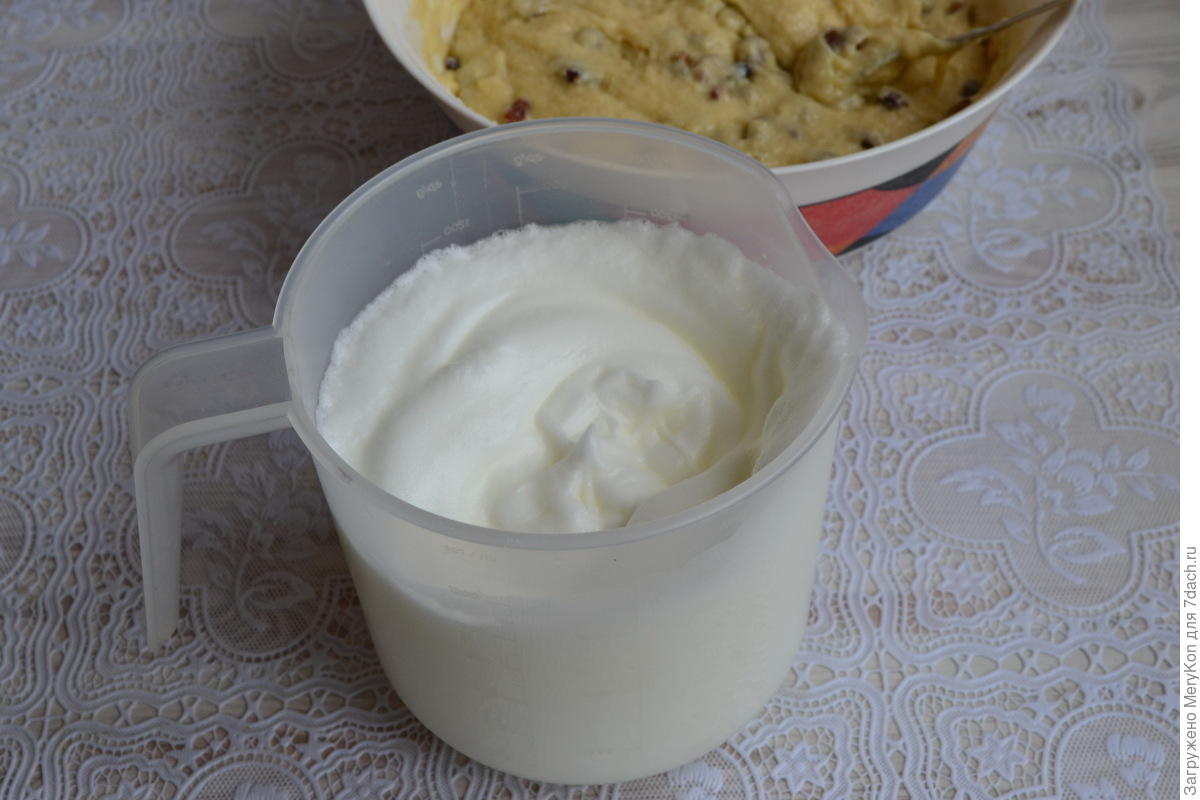 Аккуратно вводим белки (частями) ложкой в тесто. Тесто получается достаточно вязким и совсем не крутым.