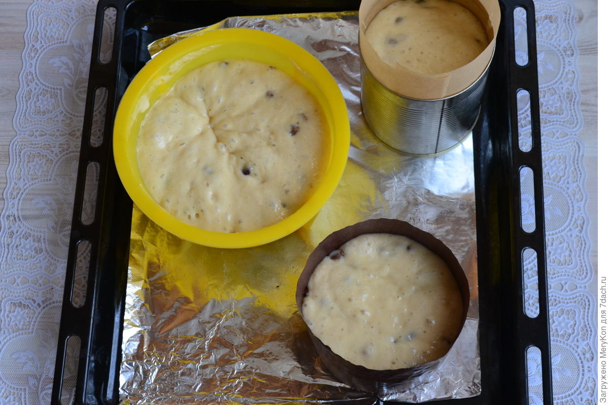 Раскладываем тесто по формам. Формы заполняем меньше чем наполовину, потому что тесто сильно поднимается. Делаем в центре углубления, кладем в них по небольшому кусочку масла и ставим в теплое место (я ставлю в слегка подогретую духовку). Когда тесто поднимется, отправляем в разогретую духовку на примерно 40 минут (время зависит от размера форм) при температуре 180 градусов. Готовые куличи слегка остужаем.