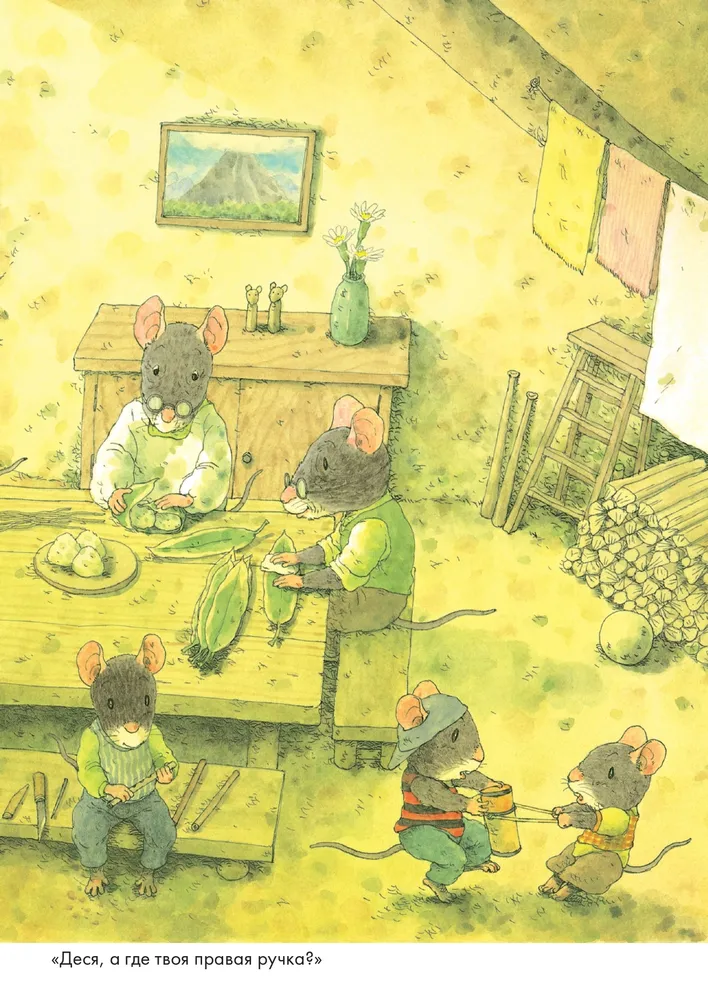 У всех есть свои привычные дела и роли: шестеро мышат отправляются за свежими ягодами, мама, бабушка и две старших дочки пекут пирожки.