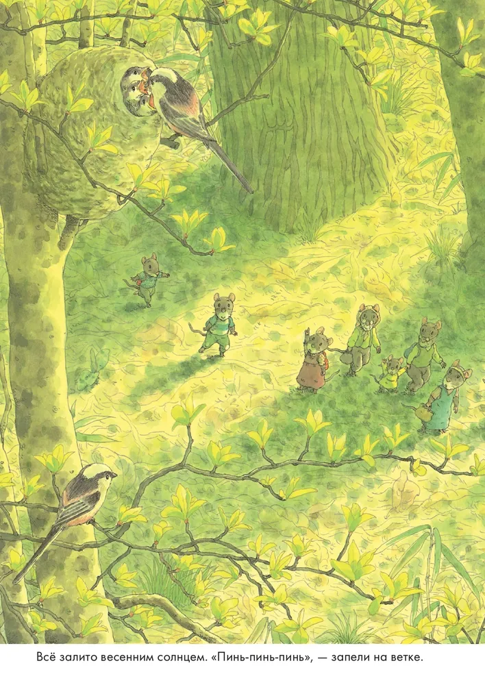 В книге "14 лесных мышей. Пикник" все семейство отправляется на прогулку в весенний лес.