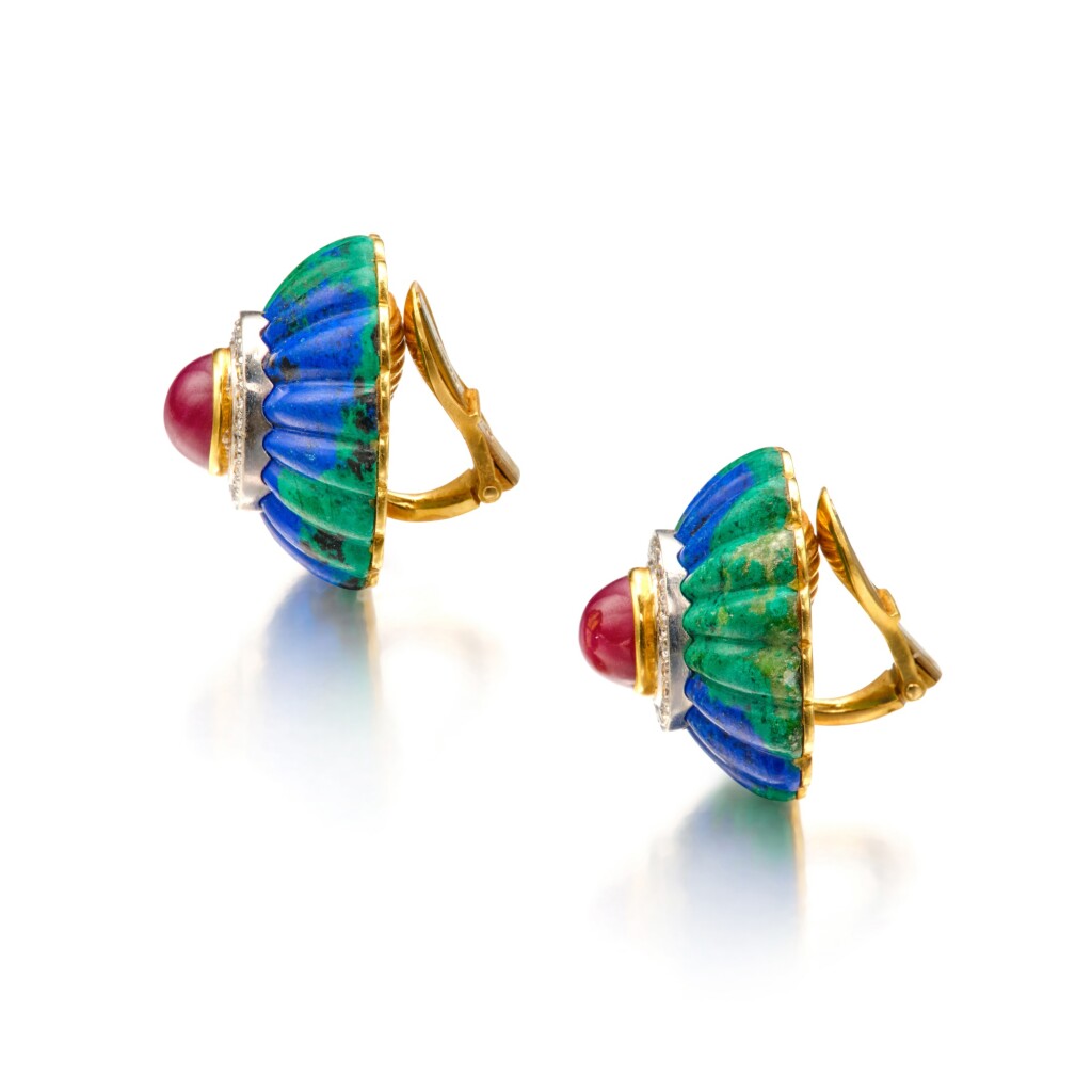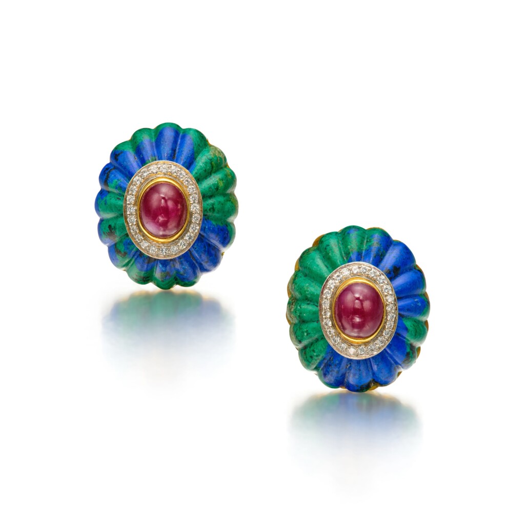 Pair of Azurmalachite, Ruby and Diamond Earclips